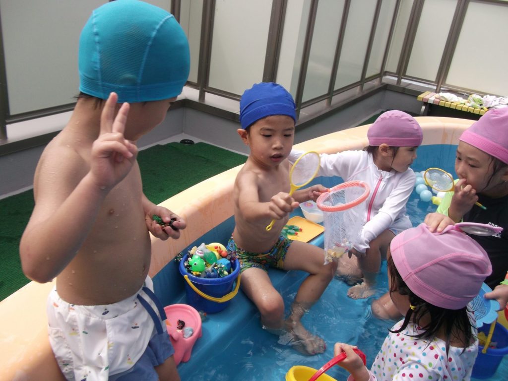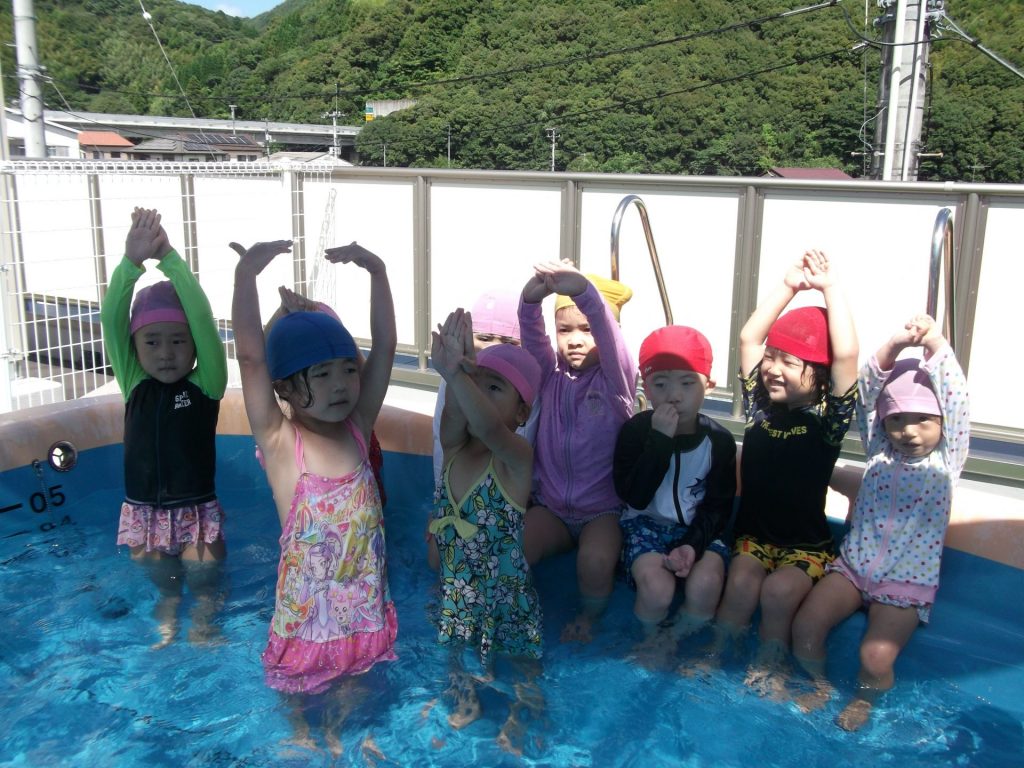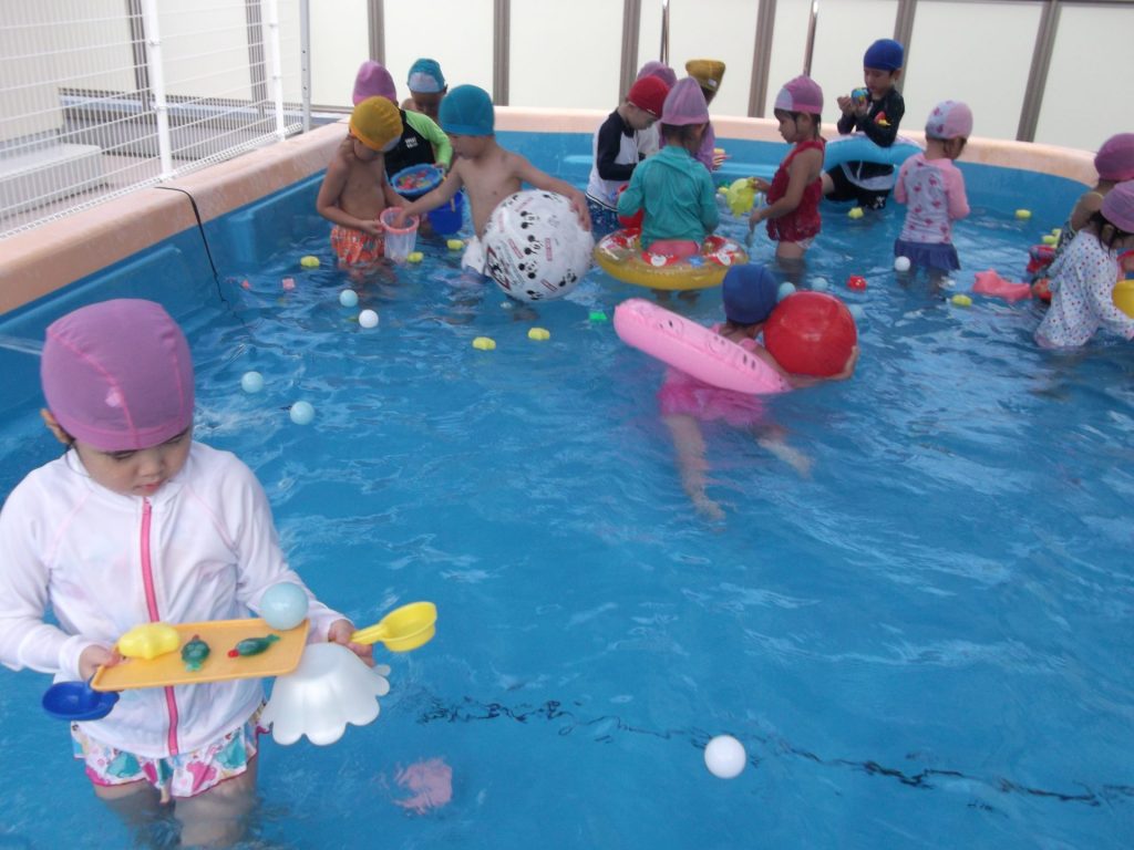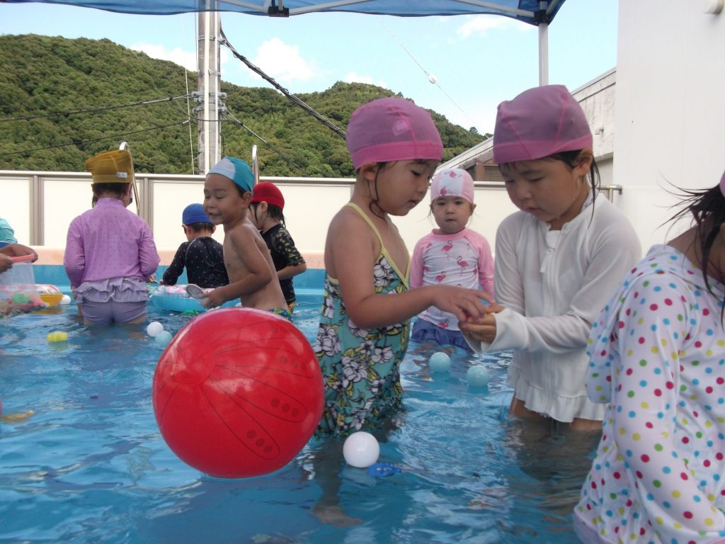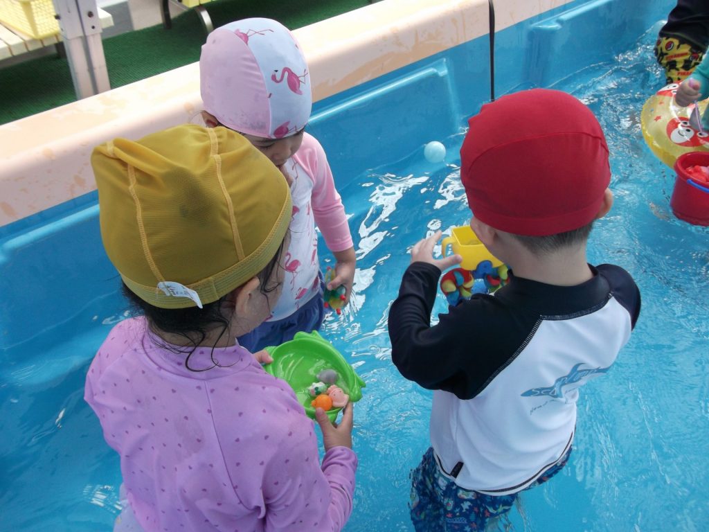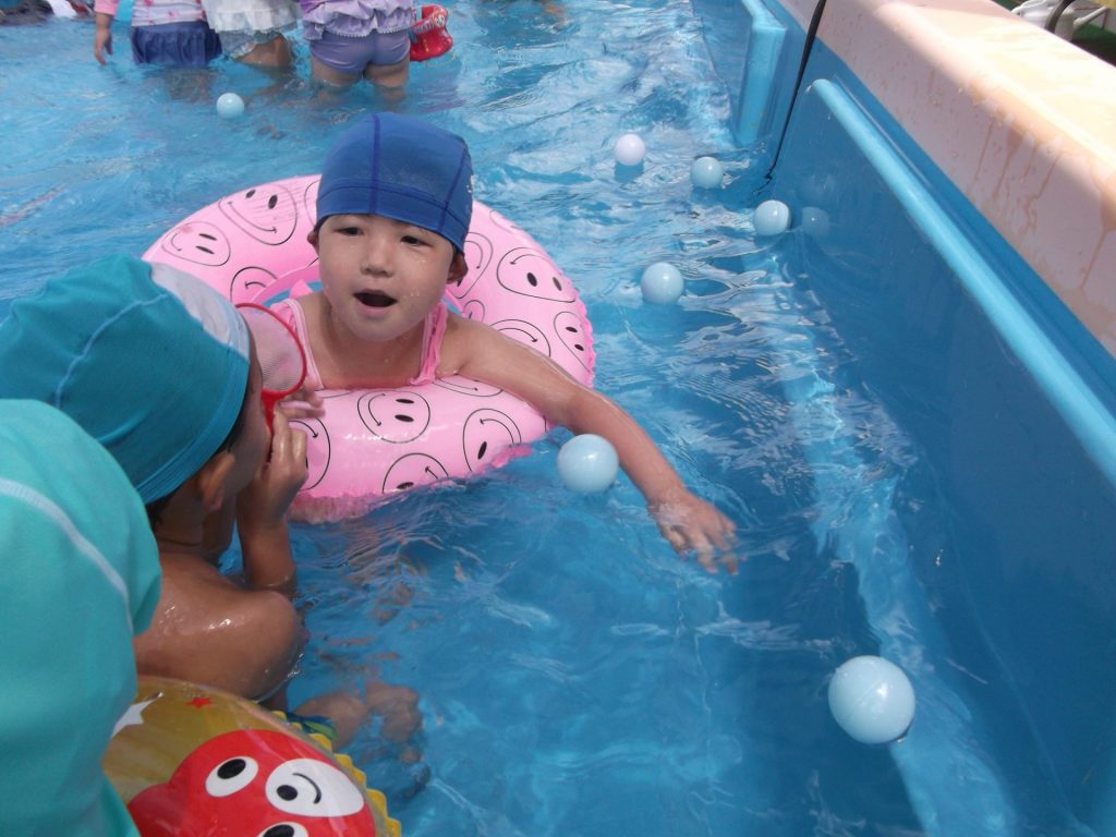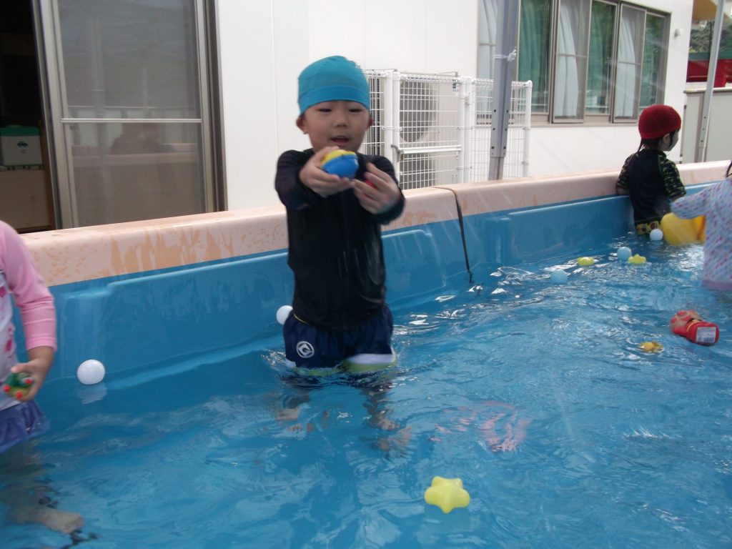 暑い。暑い。 暑い日はプールで遊びましょう。 りす組さんのプール遊びの様子です。