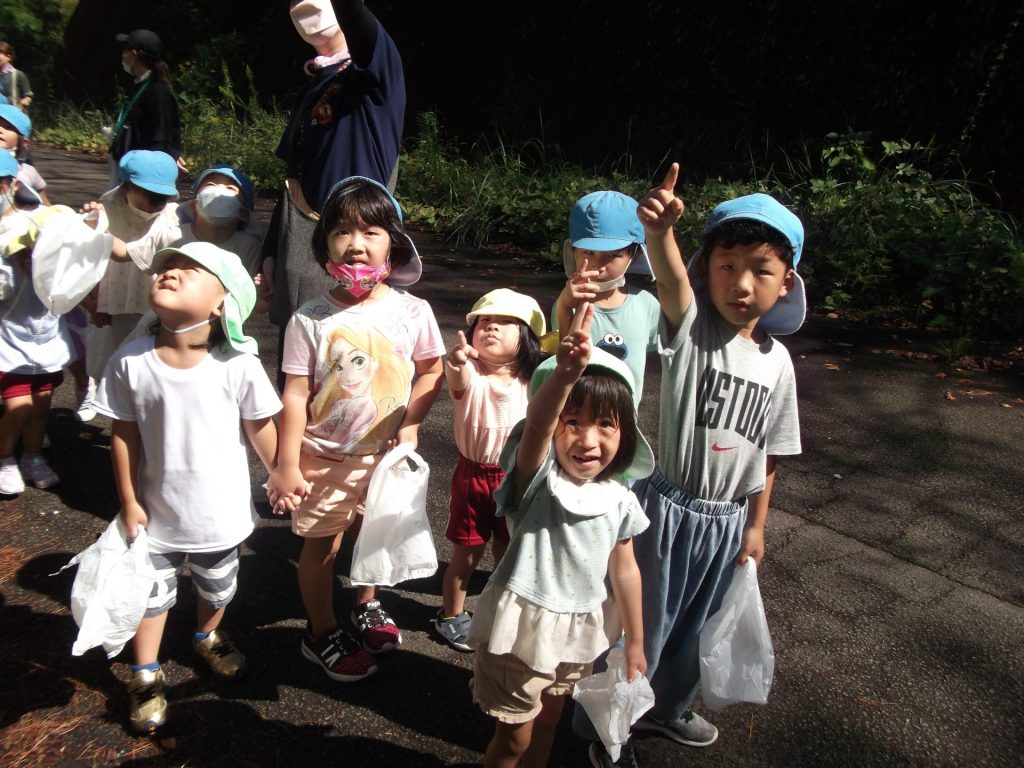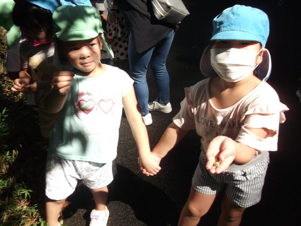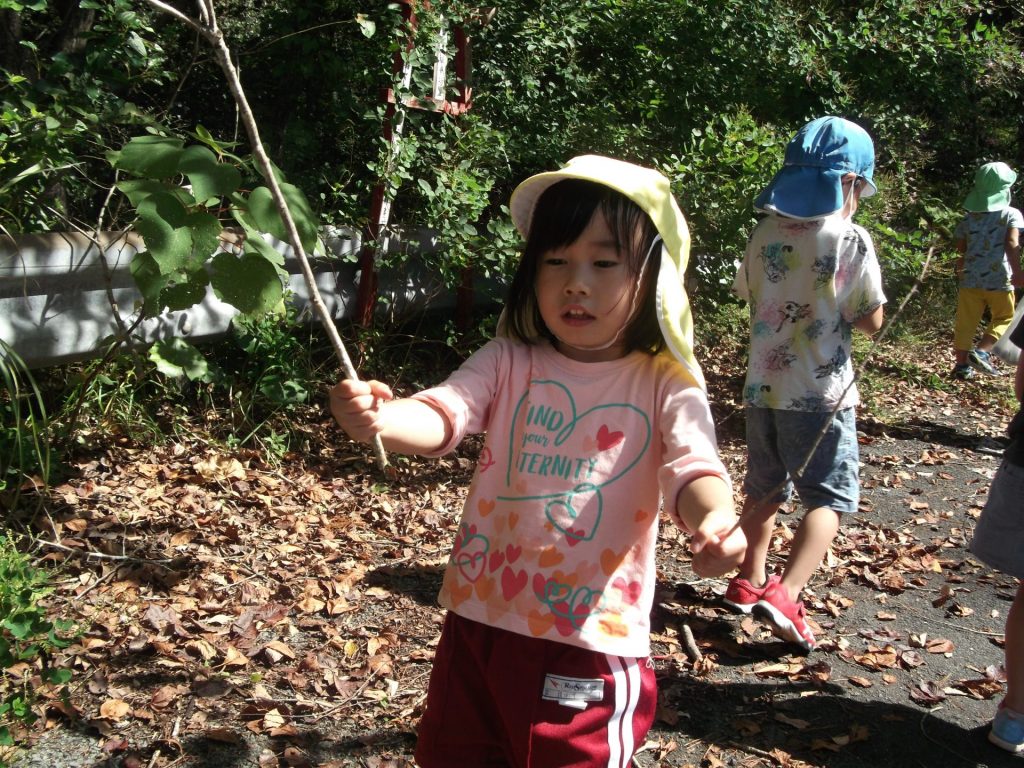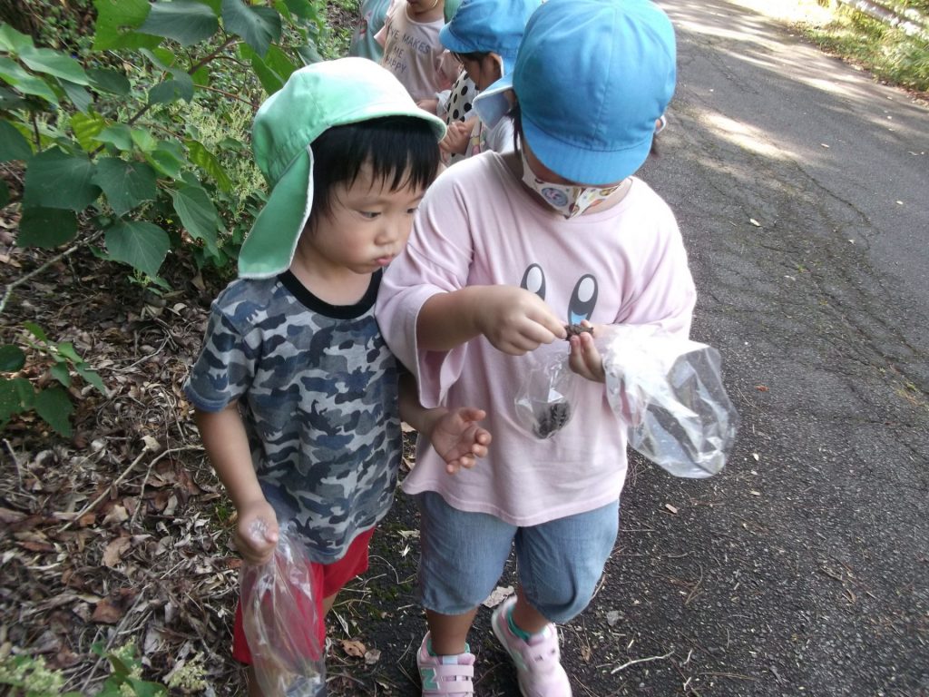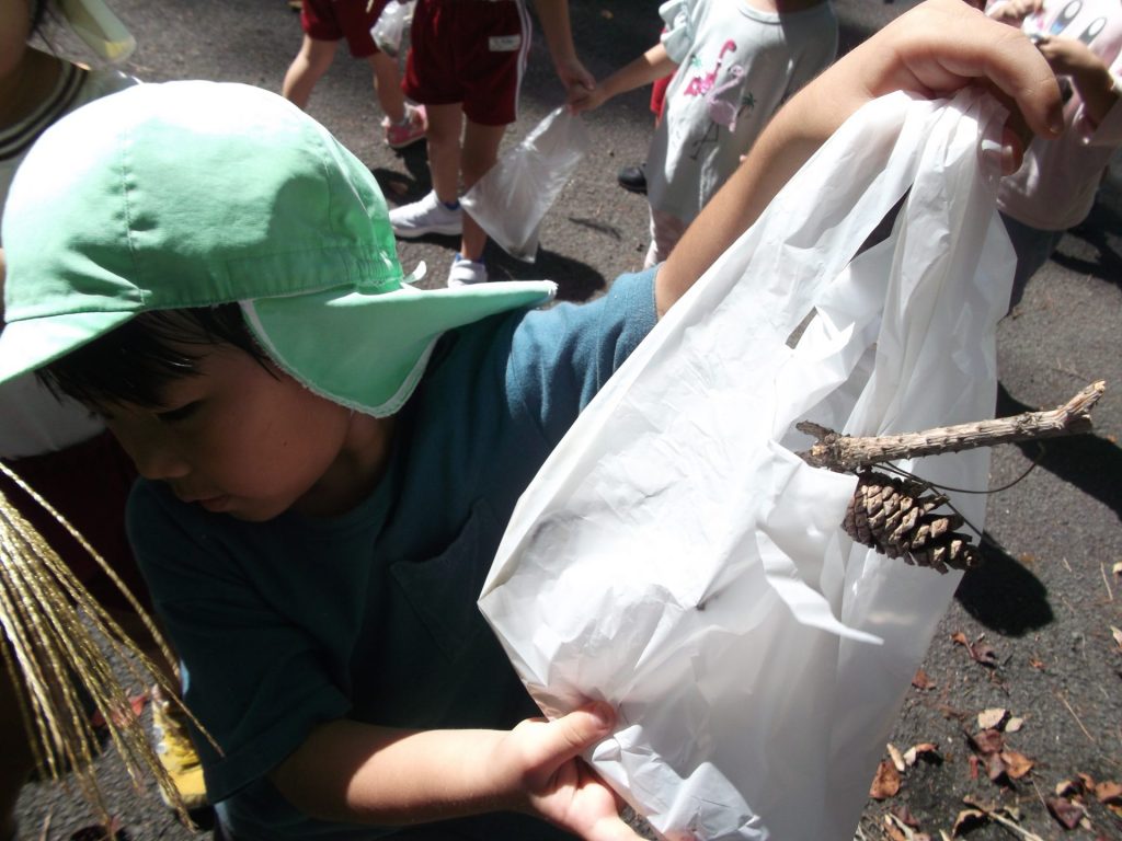 保育園に帰る頃には、松ぼっくり、どんぐり、くり、ススキ、木の枝など思い思いに拾って、袋がパンパンでした。自分で、拾ったものを嬉しそうにみせてくれました。きっと、秋の自然物を使って、みんな一緒に楽しいものを作ってくれるでしょう。楽しみにまってます!