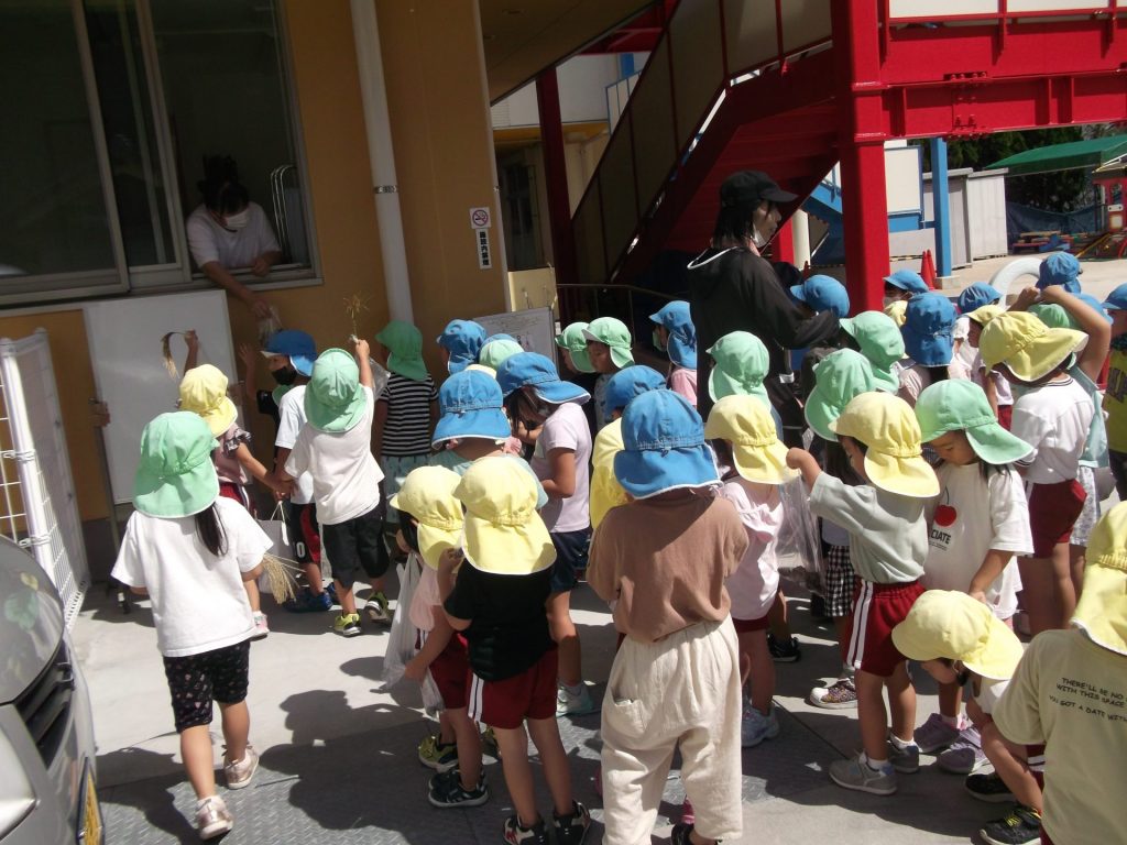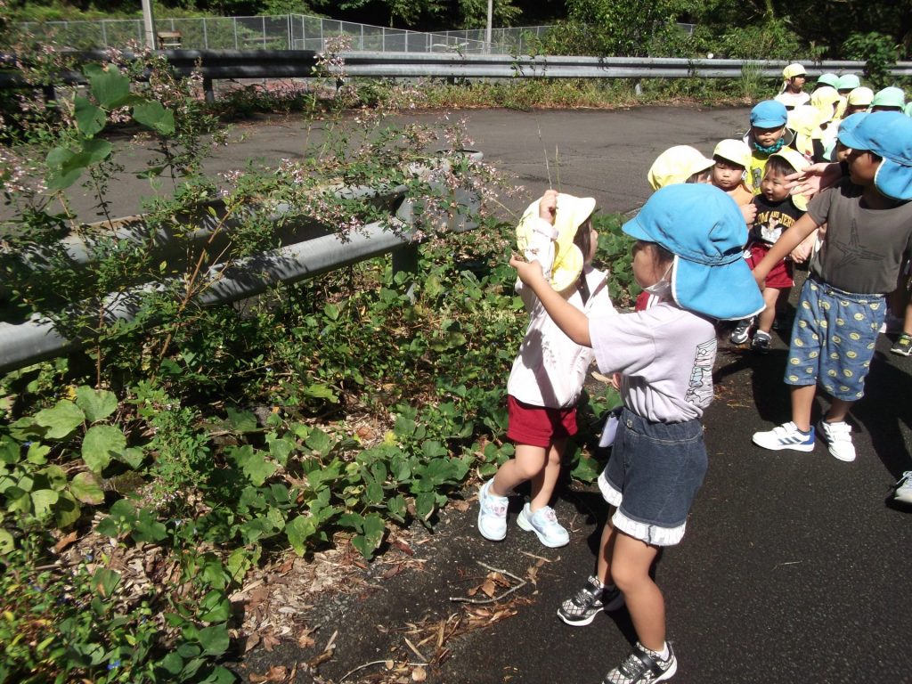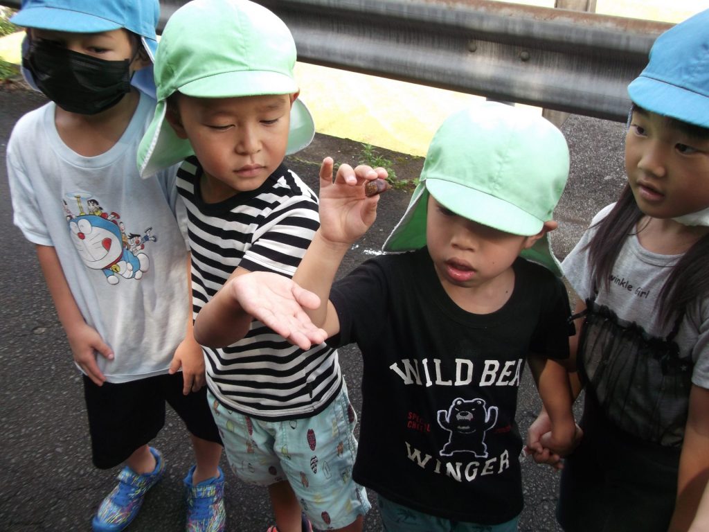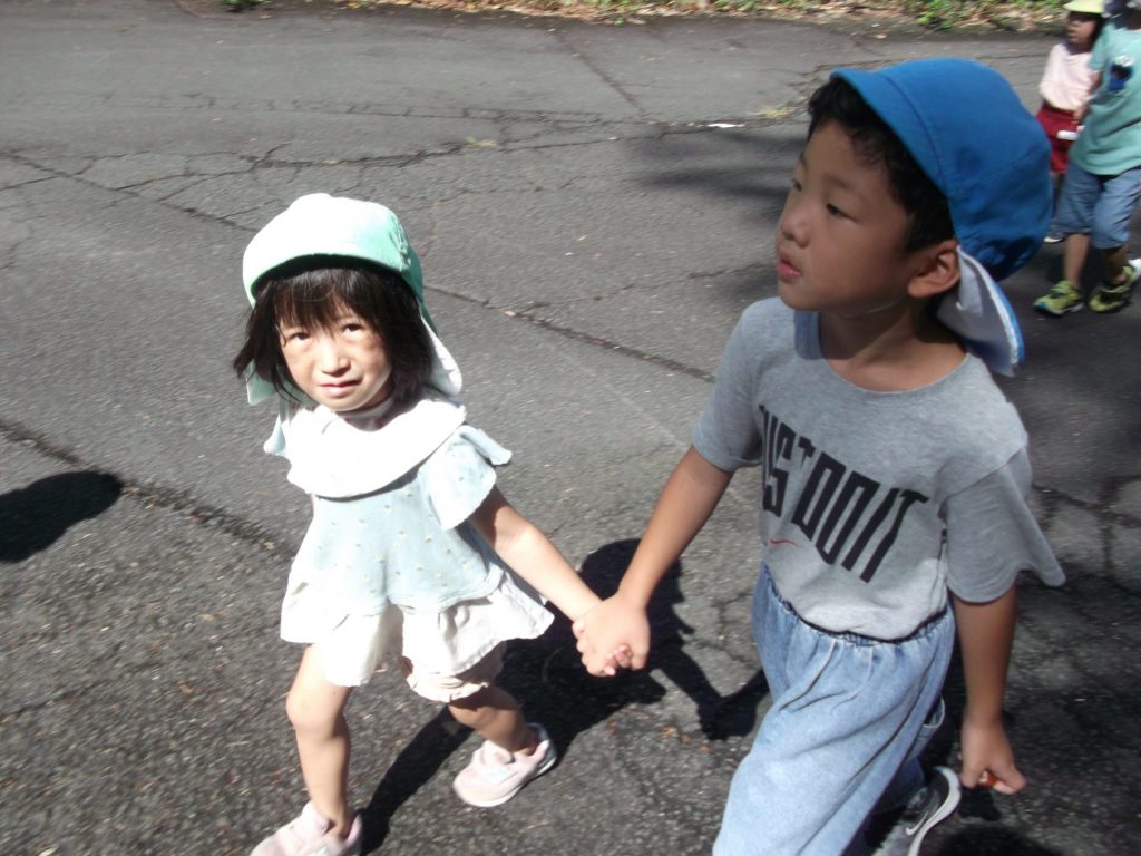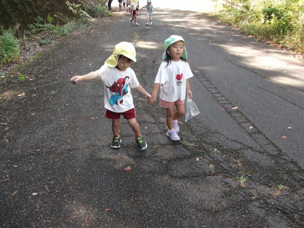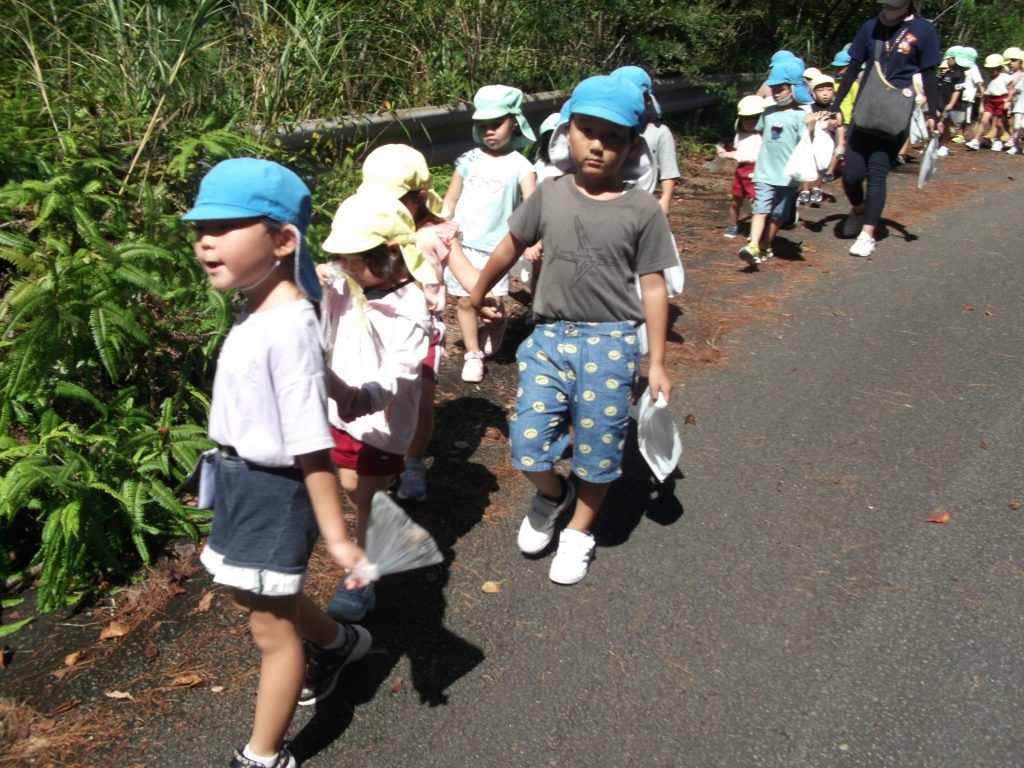 保育園に帰る頃には、松ぼっくり、どんぐり、くり、ススキ、木の枝など思い思いに拾って、袋がパンパンでした。自分で、拾ったものを嬉しそうにみせてくれました。きっと、秋の自然物を使って、みんな一緒に楽しいものを作ってくれるでしょう。楽しみにまってます!