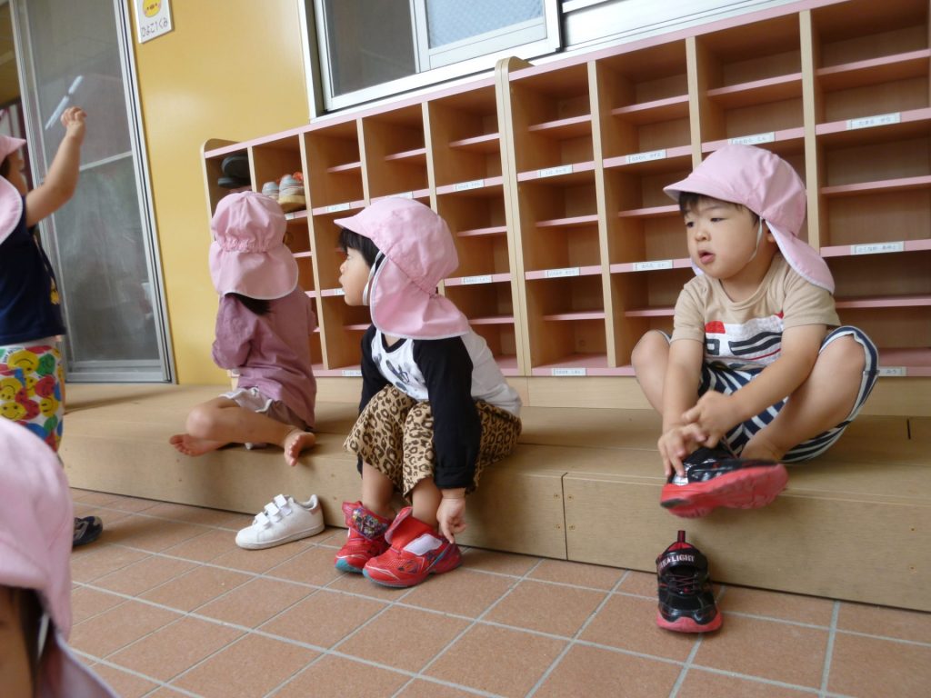 外遊びに出発。自分で靴を履いています。