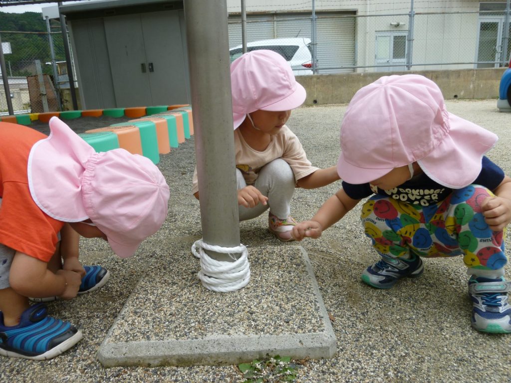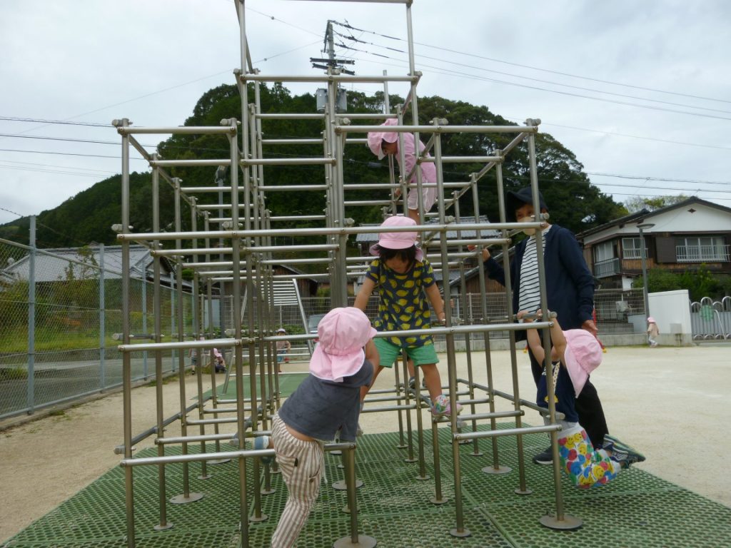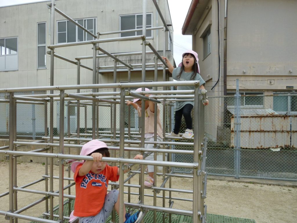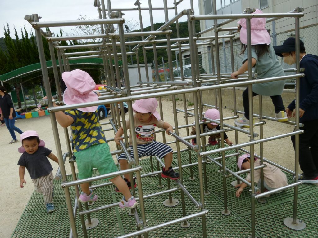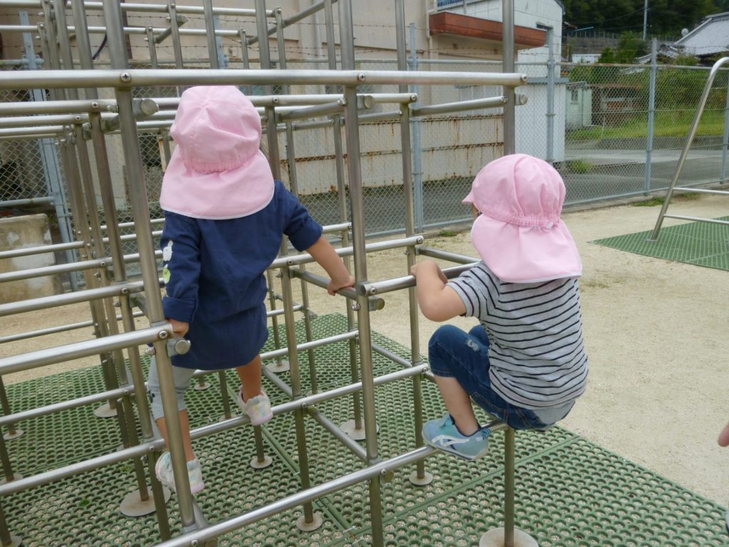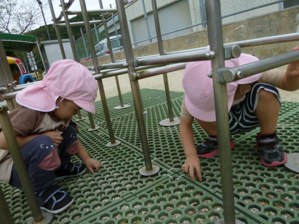 ジャングルジムのマットの模様の中が気になるぼくたち。