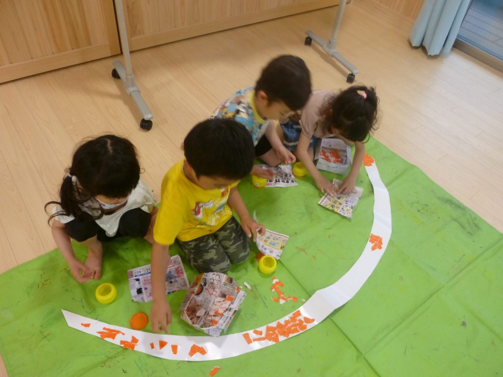 お外に、なかなか行けないので、明るくなるように虹を作ることにしました。 グループに分かれて、白画用紙に色紙をはっていきました。黄緑。