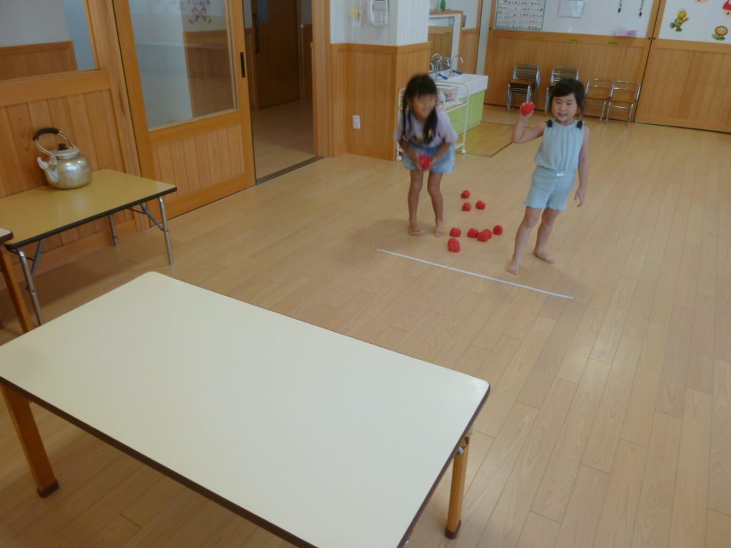 上手く机の上に玉がのっかるように、力加減をしながら 玉を「えい!」・・・「おしい!」「残念!」と言いながら、何回もチャレンジ ・・・真剣な表情です!