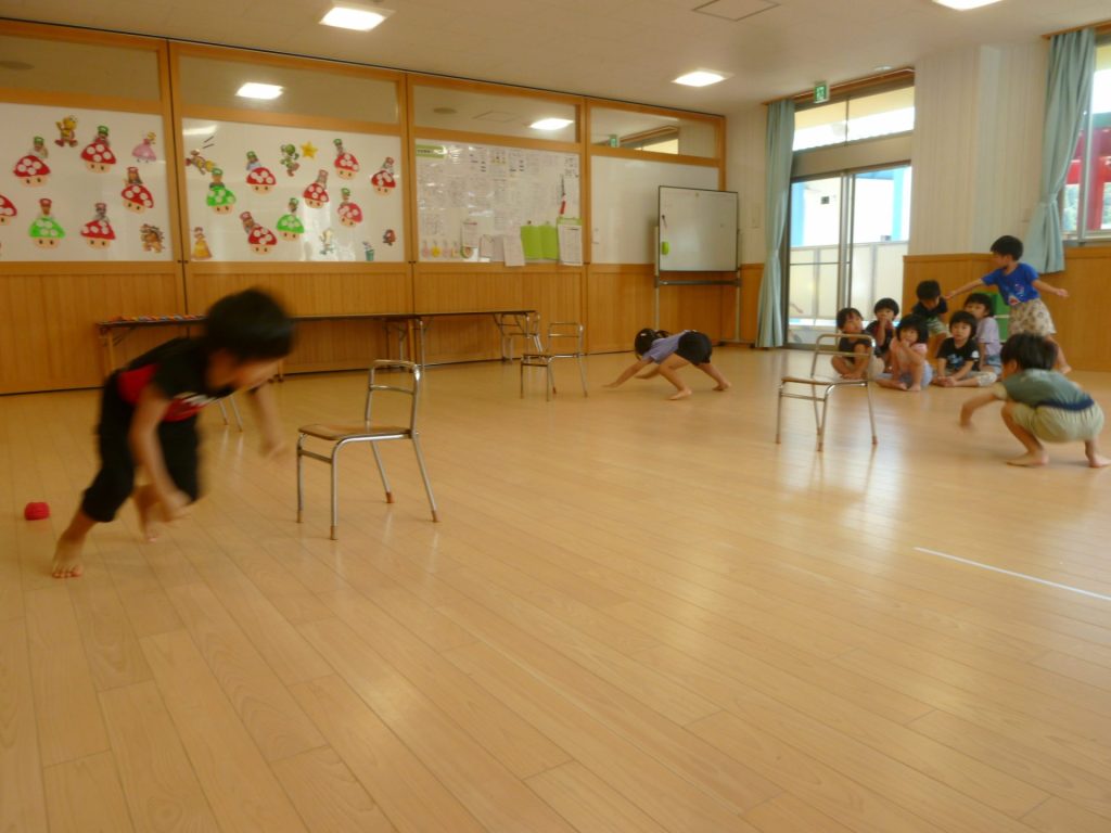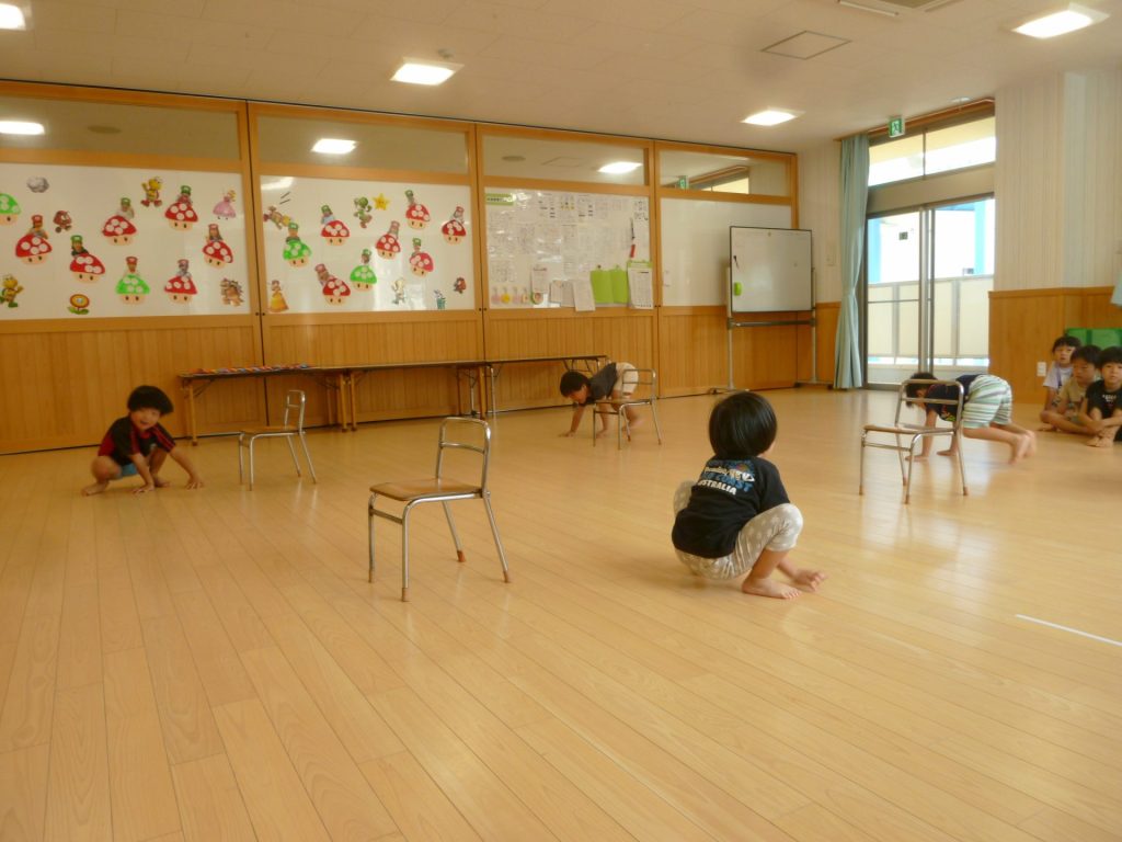 体操教室で芳谷先生に習った”くま歩き”や”玉のせ”に 再チャレンジ!「がんばるぞー!」とやる気満々のりす組さん☺ くま歩きで、椅子の周りを回ったり・・・