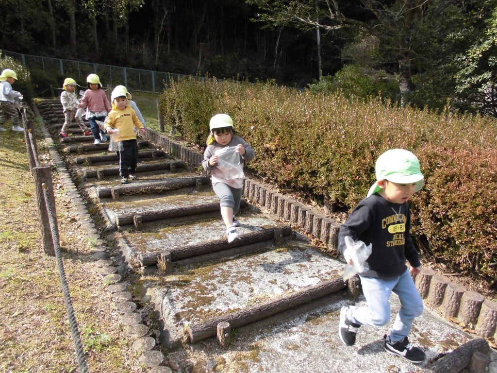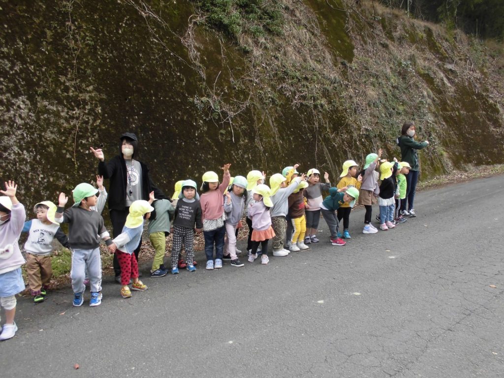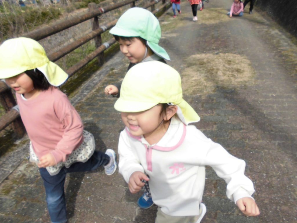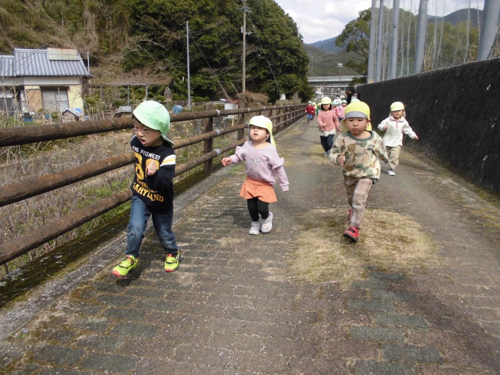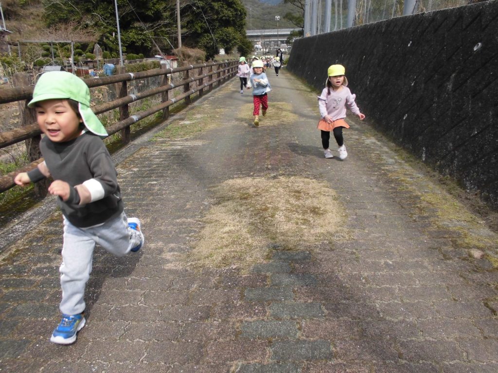 ねこ組とりす組でお散歩。交通ルールを守って、春探しに行きます! 遊歩道をダッシュ‼ 元気いっぱいの子どもたち。
