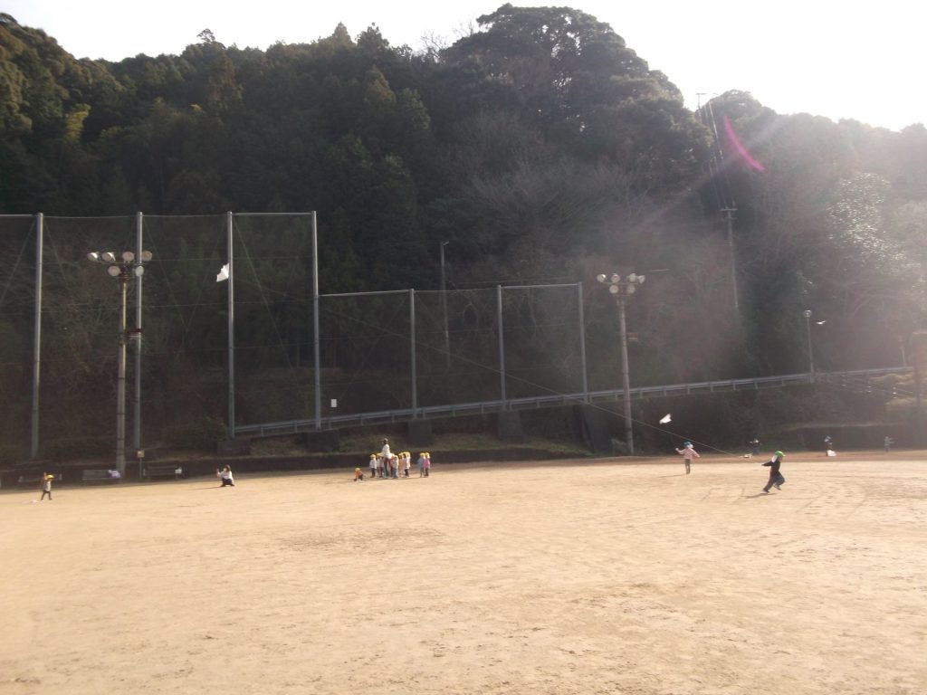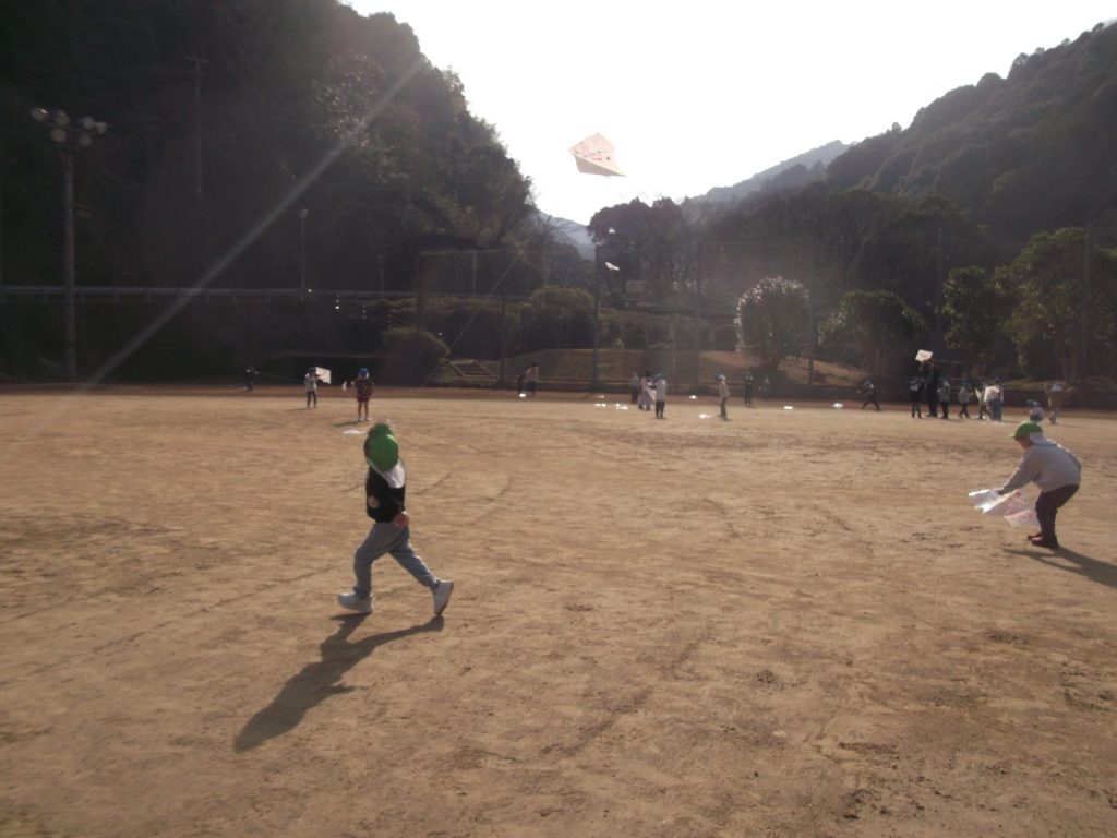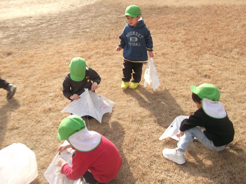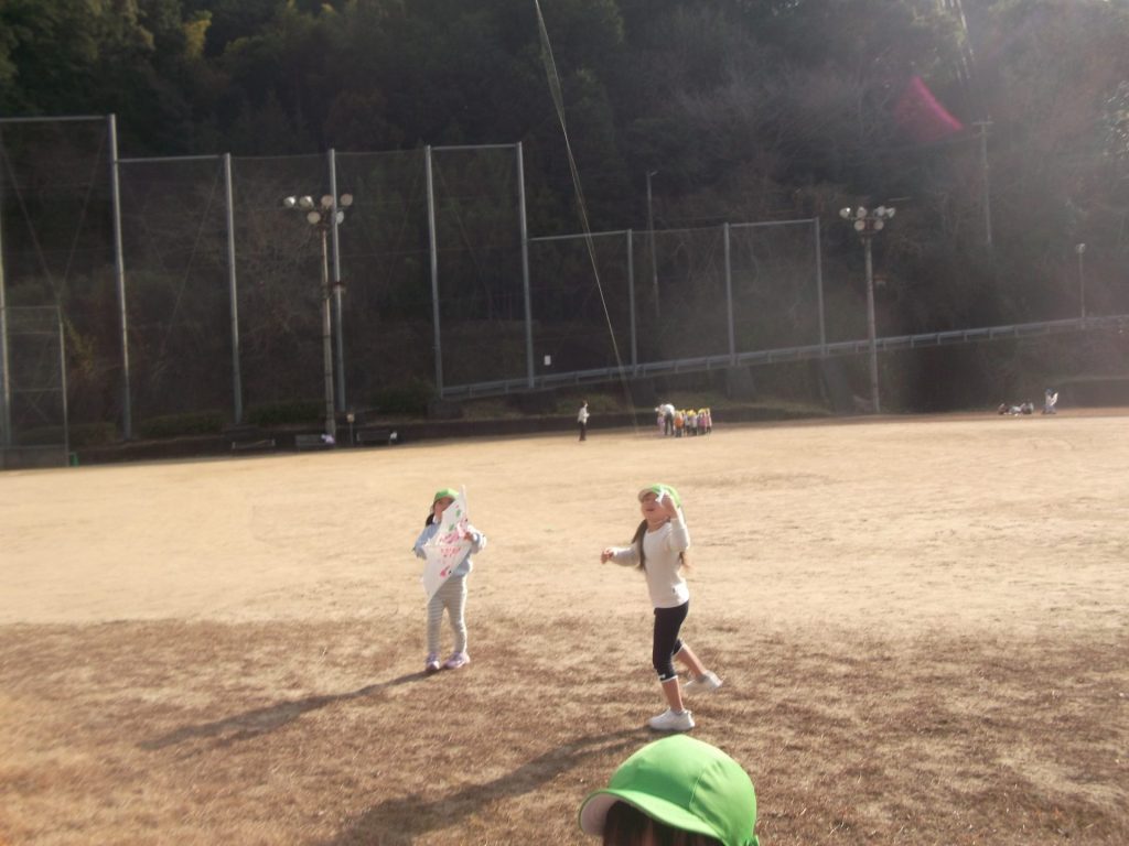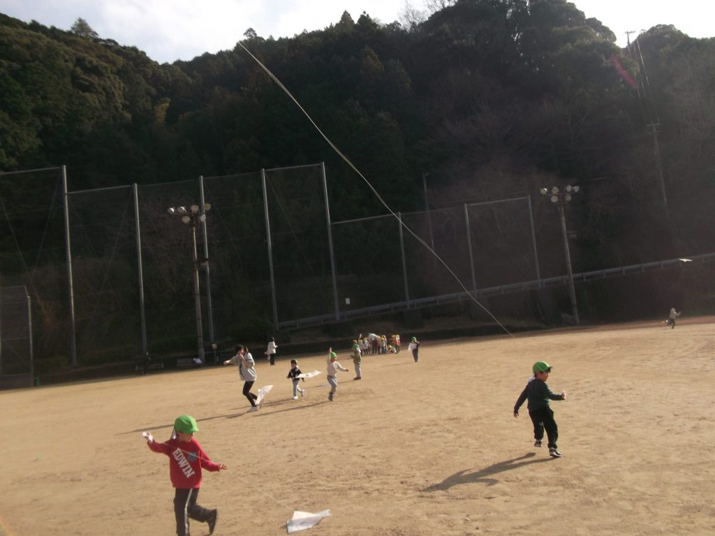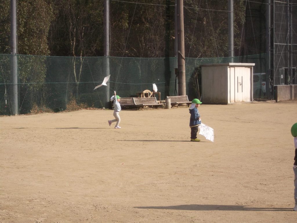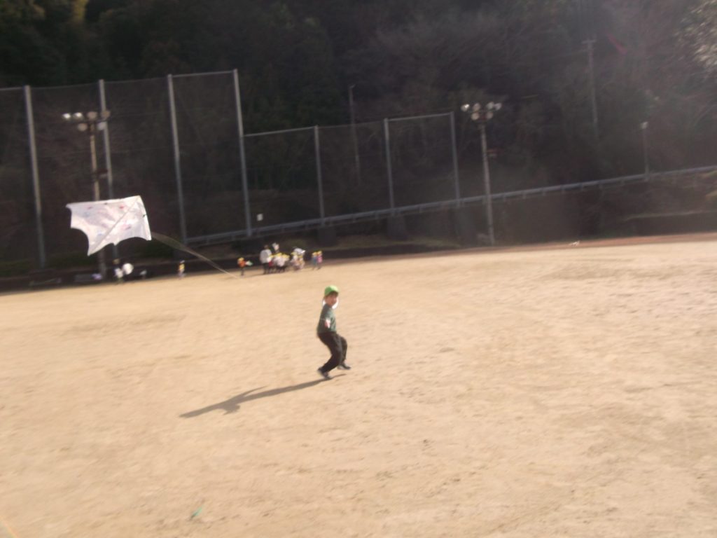 今日は 久しぶりに 全員そろいました♡ やっぱりみんなそろうと楽しいね☺ 午後から、ぱんだ組さん りす組さん ねこ組さんで 凧あげにグラウンドへ行きました。その前に、公園でも遊び・・・四つ葉のクローバーを探したり、すべり台やアスレチックでたくさん体を動かしました。今年初の凧揚げに挑戦した子どもたち♪ 一生懸命走り「天まであがったよー!」と嬉しそうでした☺