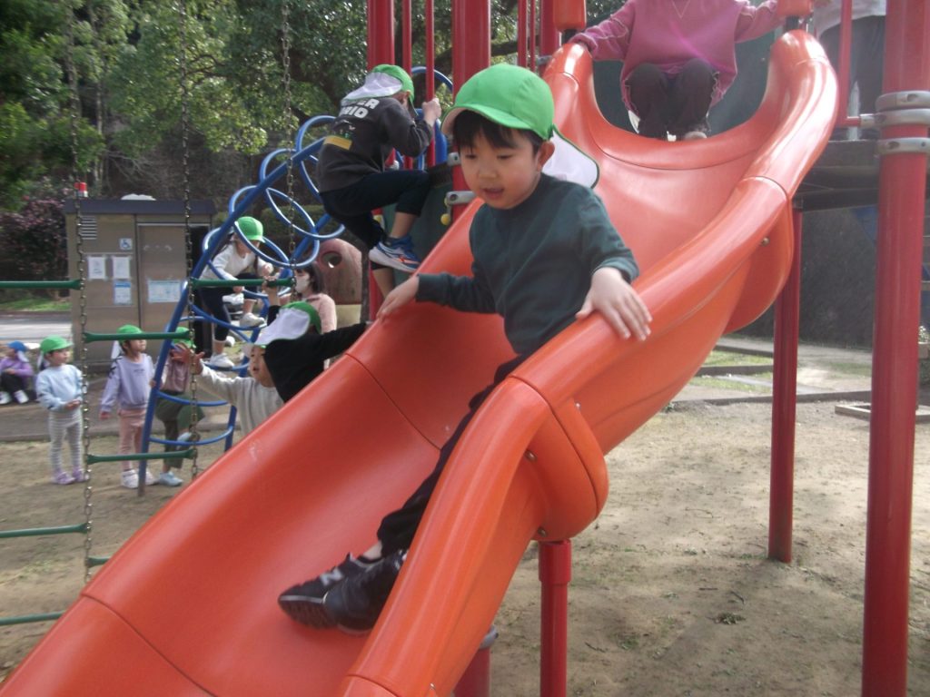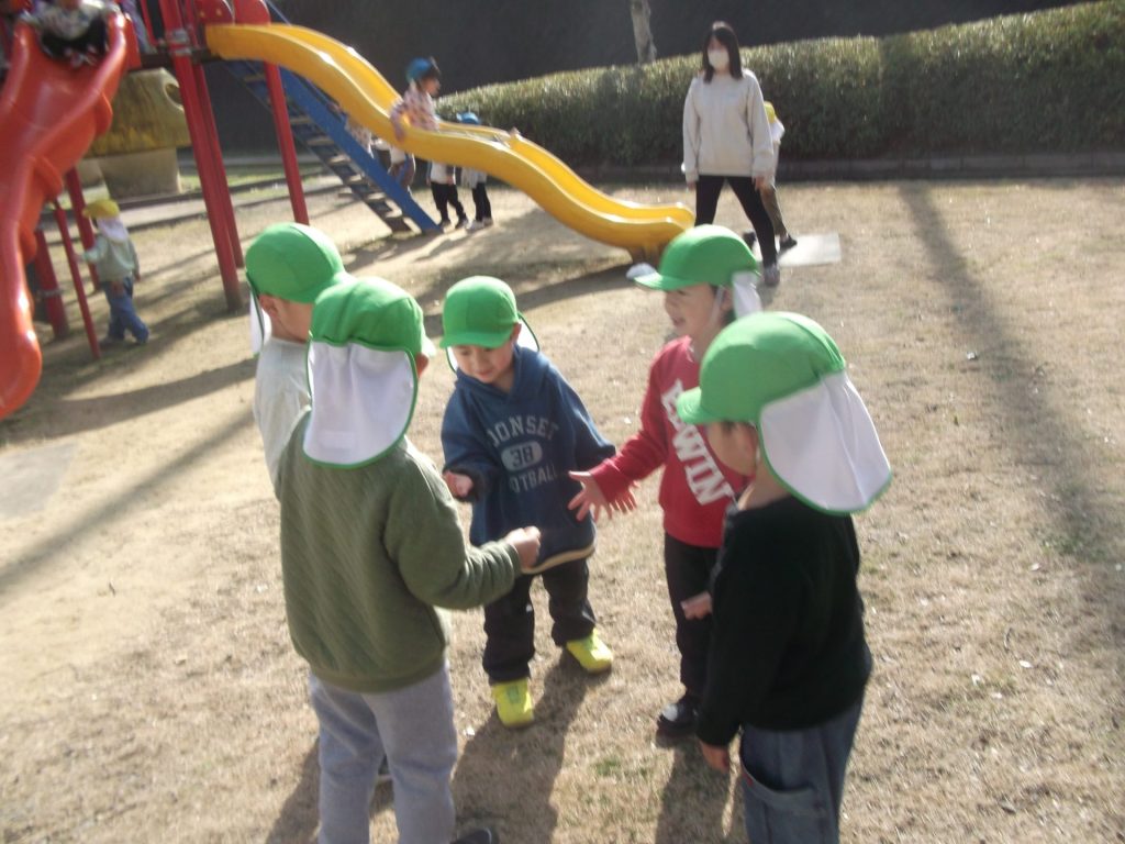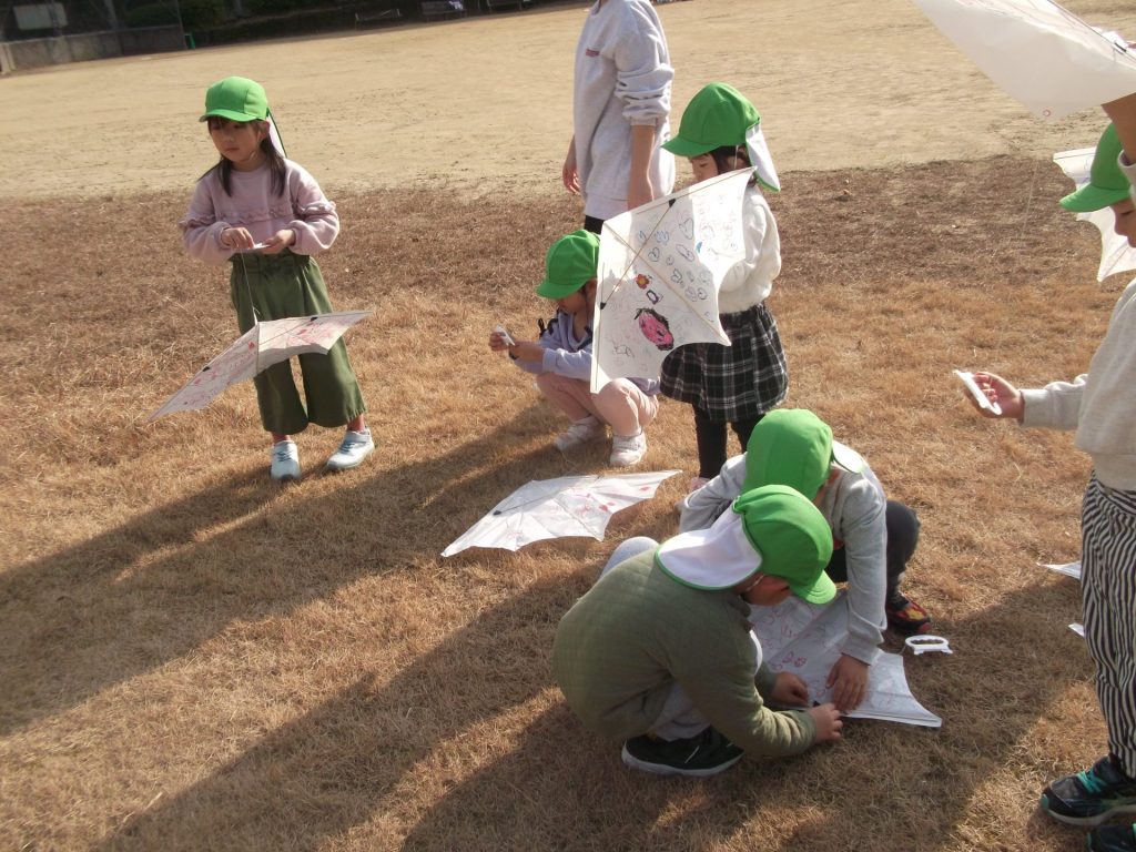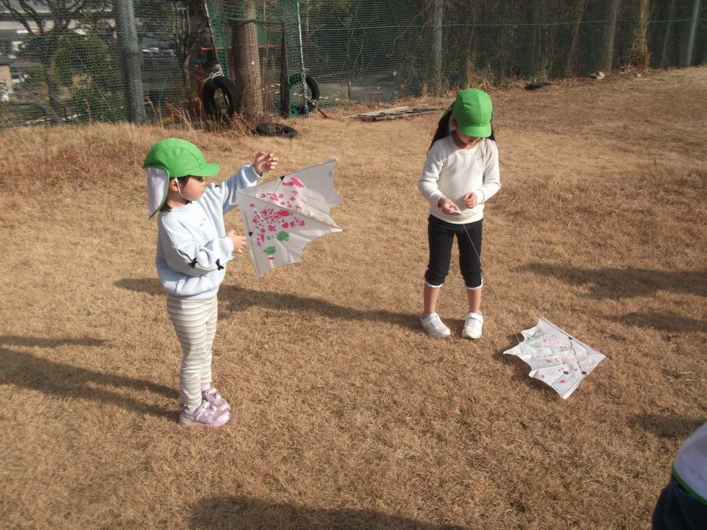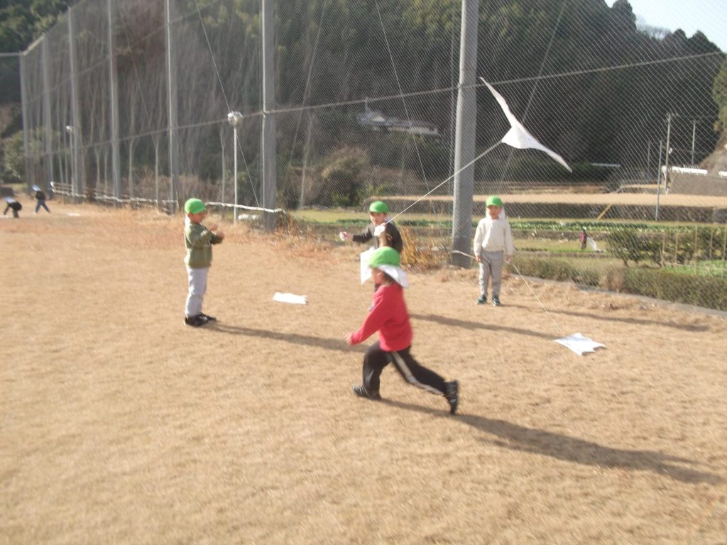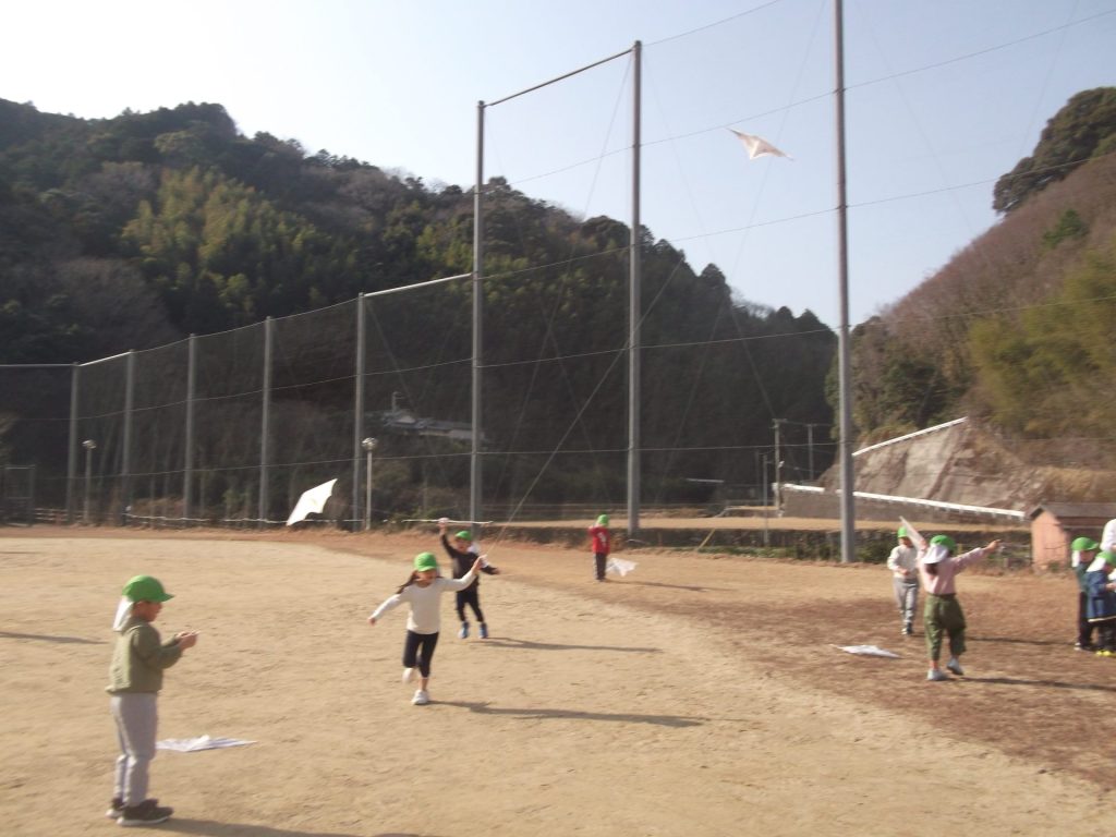 今日は 久しぶりに 全員そろいました♡ やっぱりみんなそろうと楽しいね☺ 午後から、ぱんだ組さん りす組さん ねこ組さんで 凧あげにグラウンドへ行きました。その前に、公園でも遊び・・・四つ葉のクローバーを探したり、すべり台やアスレチックでたくさん体を動かしました。今年初の凧揚げに挑戦した子どもたち♪ 一生懸命走り「天まであがったよー!」と嬉しそうでした☺
