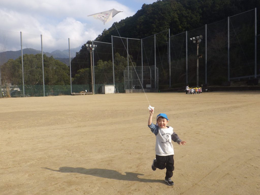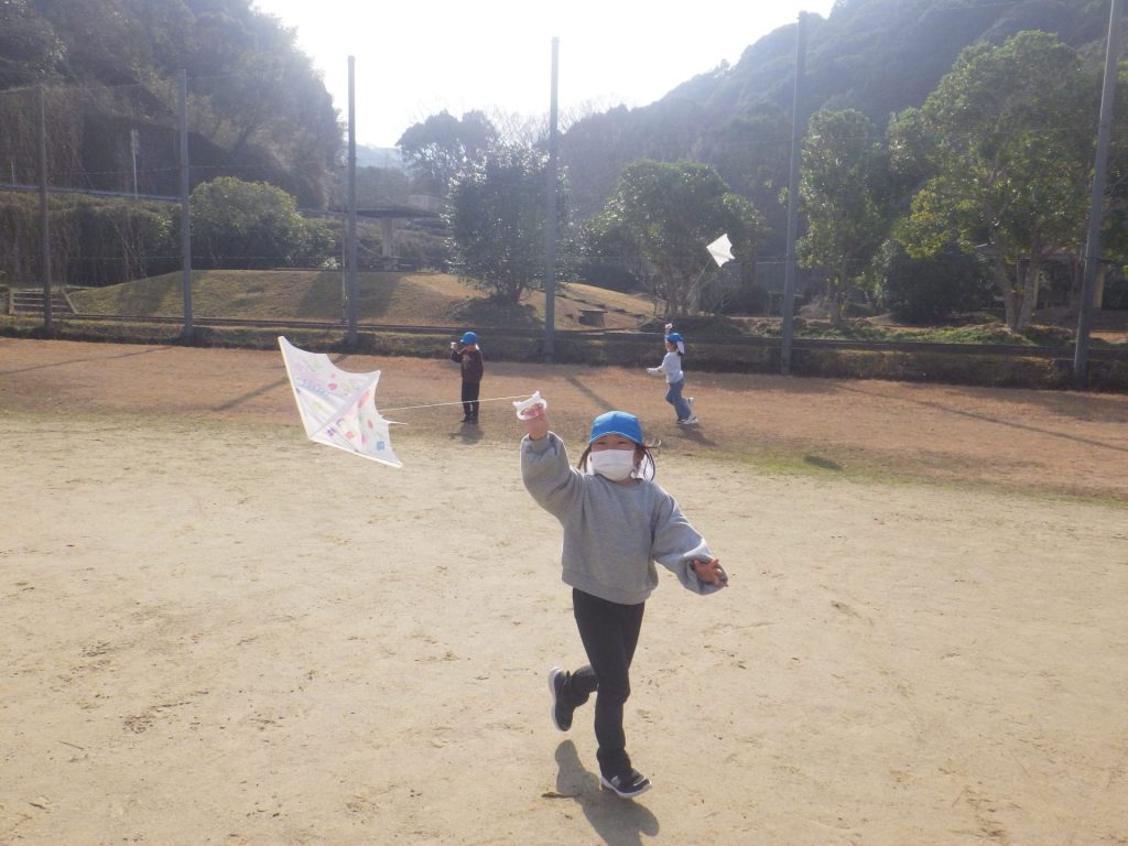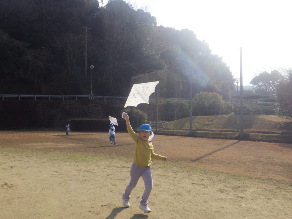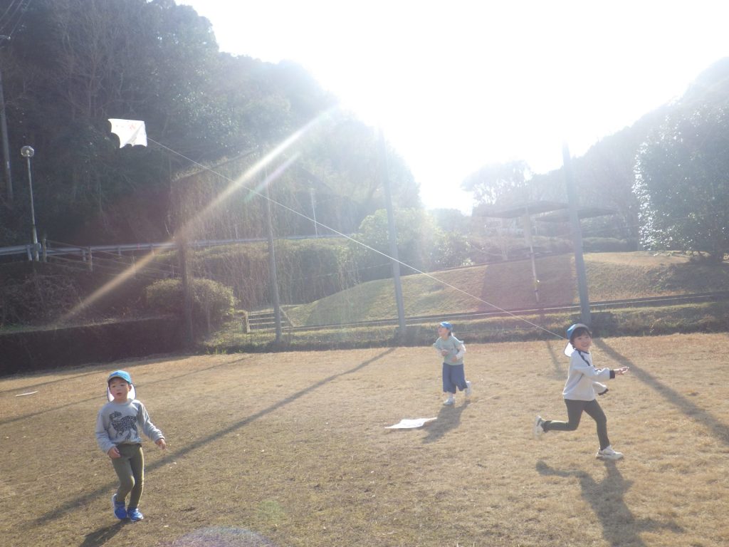 お天気のいい中、みんなで凧あげを楽しみました。風が吹いて「わぁーあがった!」と嬉しそうに 声があちこちから聞こえ、空高く上がった凧を一生懸命見上げていました。冬ならではの遊びを 思いきり楽しみました☺