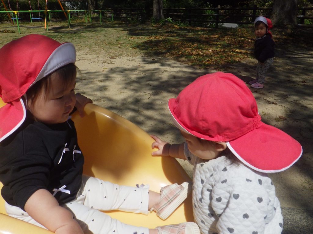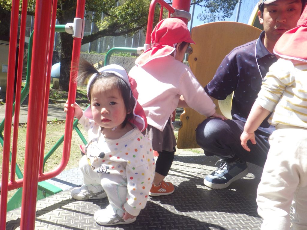 暖かい春の日差しや 優しい風を浴びながら、公園までおさんぽに出かけました。帽子をかぶると、急いで扉の所まで歩いていくなど、待ち遠しそうにしている子もいました。今日は、0歳児のお友だちも一緒にお出かけ♪ 公園では、すべり台などたくさんの遊具で遊びました。「ここにおいで~」と言わんばかりに、手を振って 嬉しそうに遊ぶ子もいましたよ☺ お天気のいい日は、たくさん外で遊びま~す❣❣