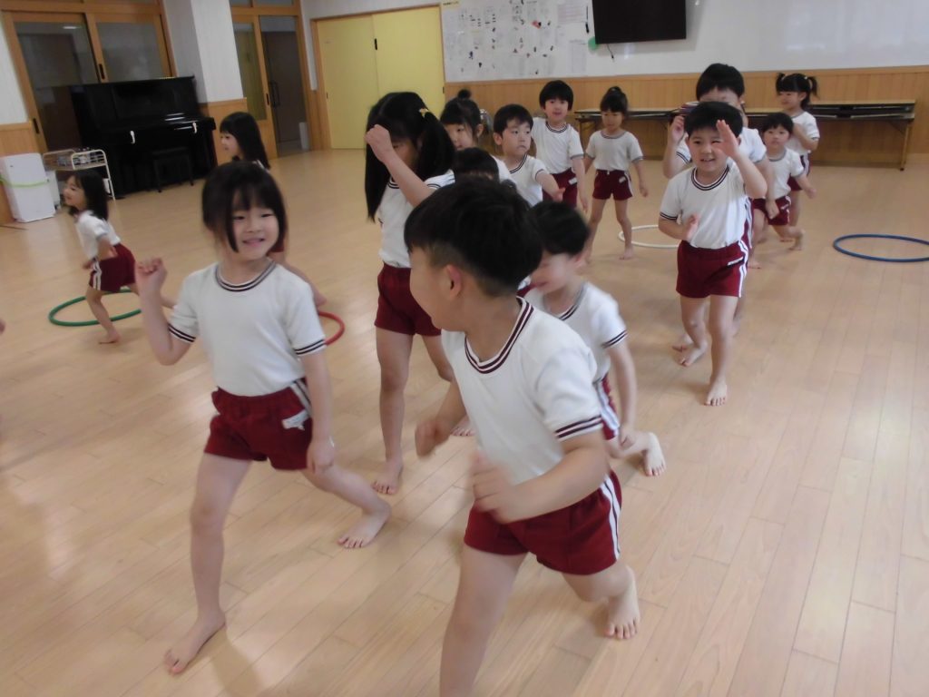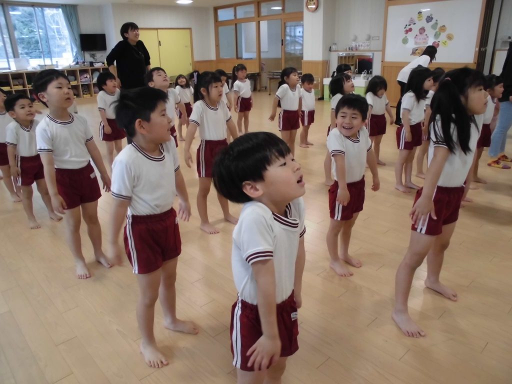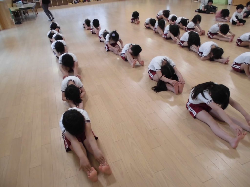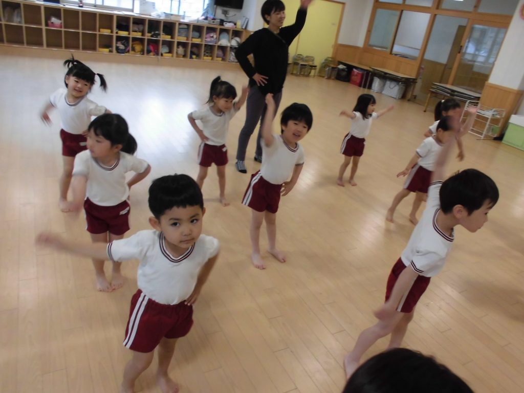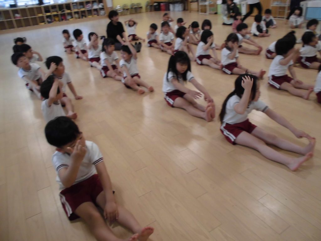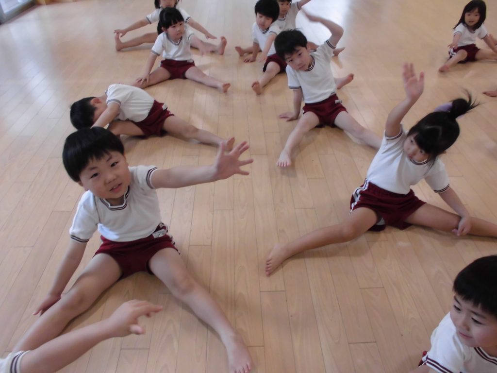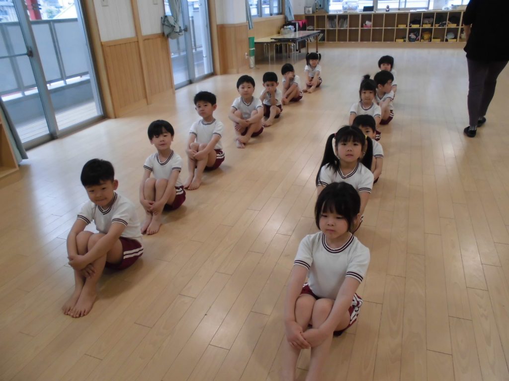 今日は、ぱんだ組になって初めてのリズム教室。さすが ぱんだ組さん。かっこよく体操座りで待っています。体操をしたり、リズムに合わせて歩いたり、ねこ組さんやりす組さんのお手本になれるよう頑張っていました。明日からお勉強 ・体操も始まります。みんなで頑張っていこう!