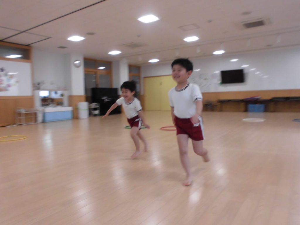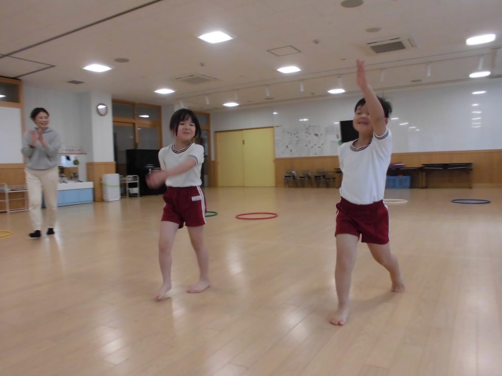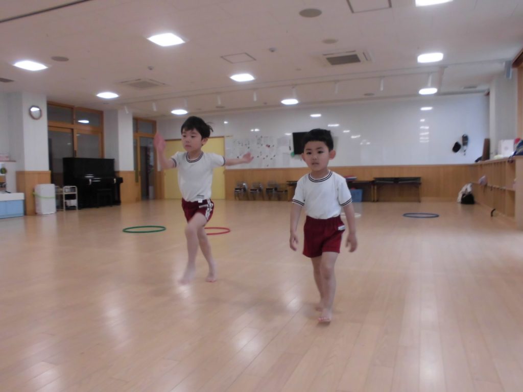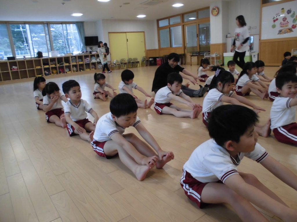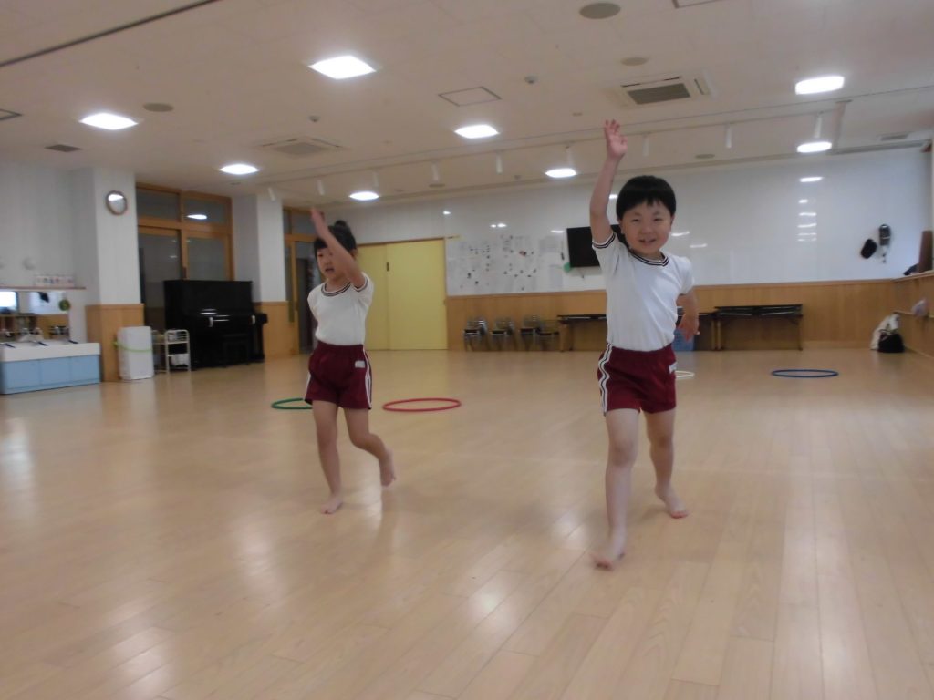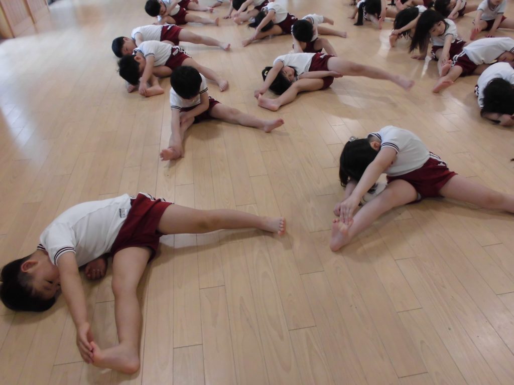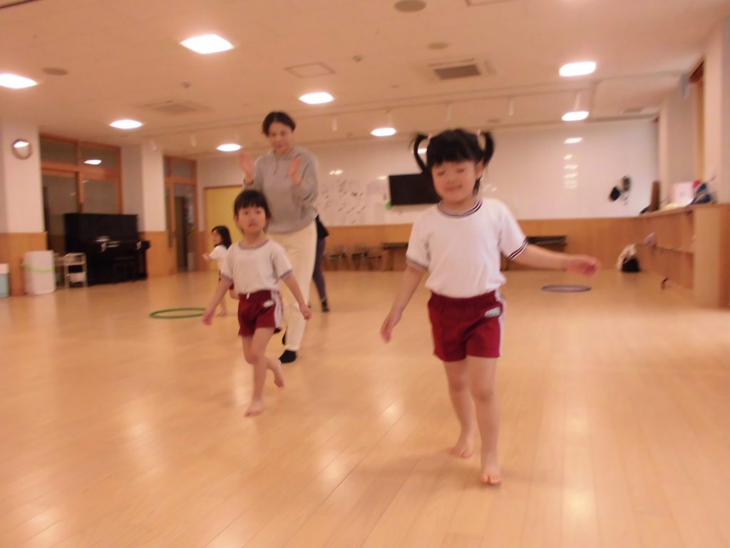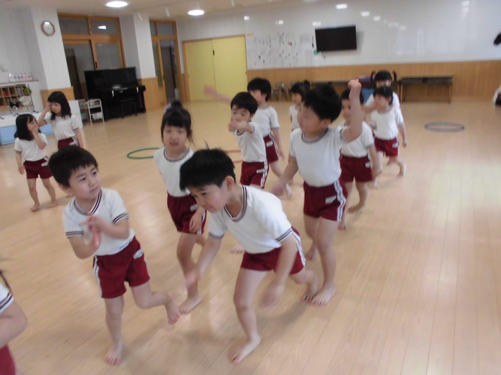 今日は、ぱんだ組になって初めてのリズム教室。さすが ぱんだ組さん。かっこよく体操座りで待っています。体操をしたり、リズムに合わせて歩いたり、ねこ組さんやりす組さんのお手本になれるよう頑張っていました。明日からお勉強 ・体操も始まります。みんなで頑張っていこう!