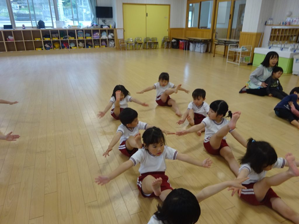 りす組さんになって 初めてのリズム教室。体操やリズムに合わせて歩いたり、いろいろな動きを楽しみました。ボールをキャッチするのも上手でした。その後も 元気いっぱいのりす組さん。タオルで綱引きをしたら、大盛り上がりでした☺