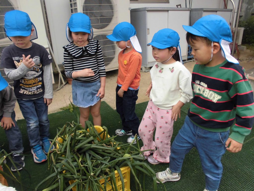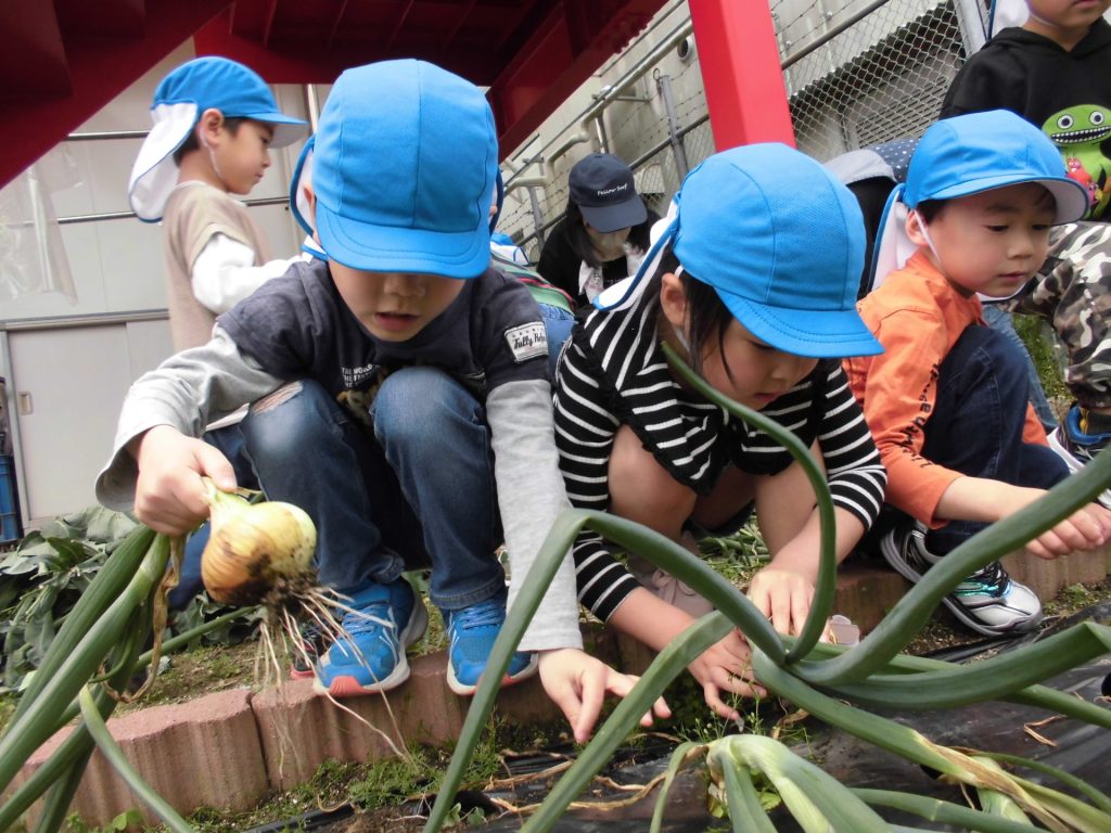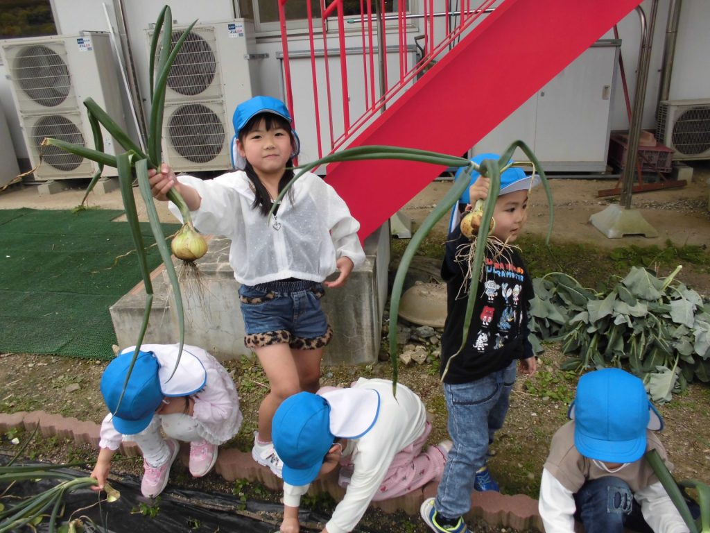 玉ねぎの収穫にチャレンジ! 近くに行くだけで玉ねぎの香りが・・・「いいにおい!」と子どもたち。松浦先生に抜き方を教えてもらい、「うんとこしょ!」「どっこいしょ!」といいながらみんな楽しそうでした♡ 何の料理に変身するかな♪ 楽しみですね☺