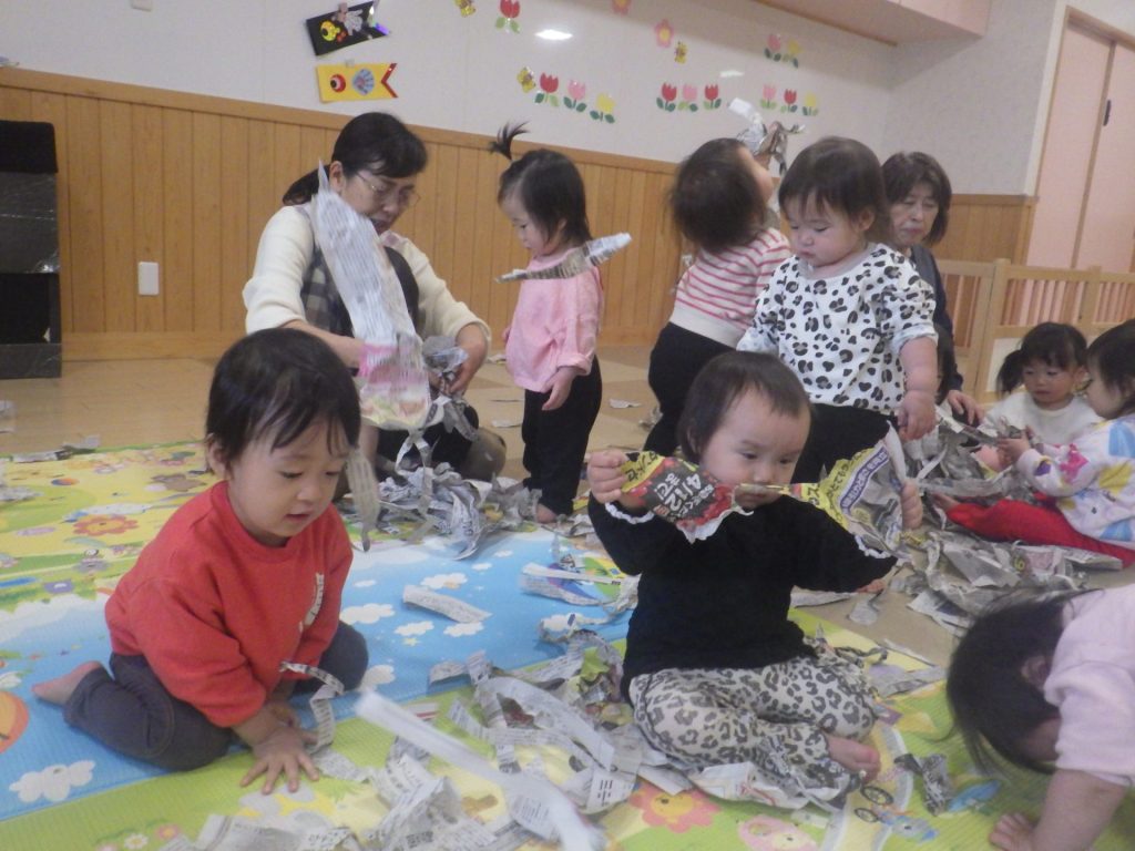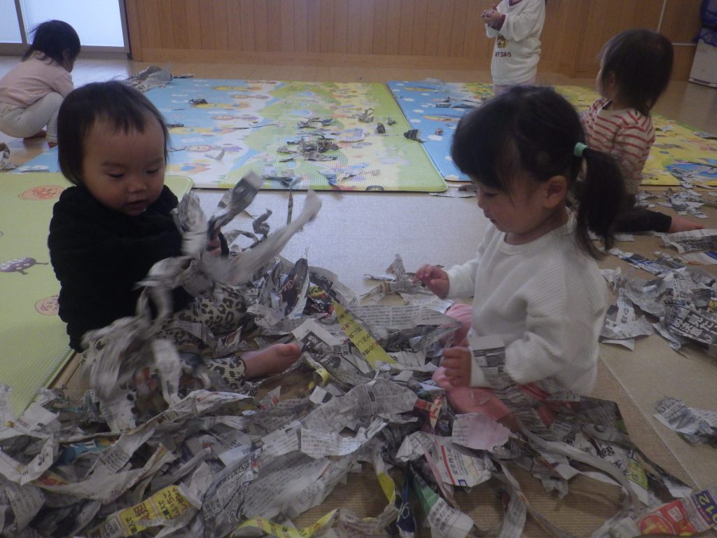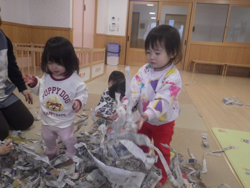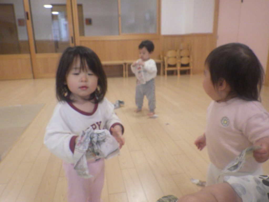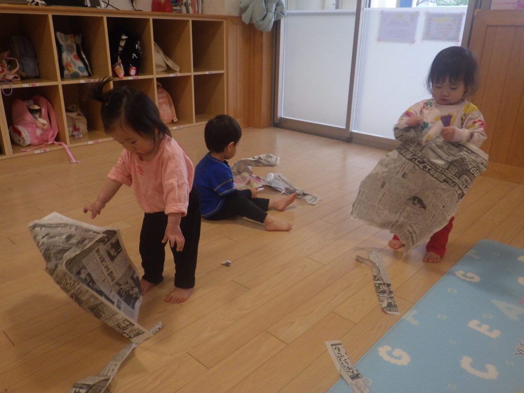 雨やお天気の悪い日が続いていますが、お部屋の中で 楽しく過ごしています。今日は新聞紙を使って、ビリビリやぶったり 集めたりして遊びました。音や感触が楽しいようで、夢中になって遊んでいました。それから・・・手作りマラカスをもち、音を鳴らして遊んだりもしています。これからも いろいろな遊びを楽しみたいと思います。