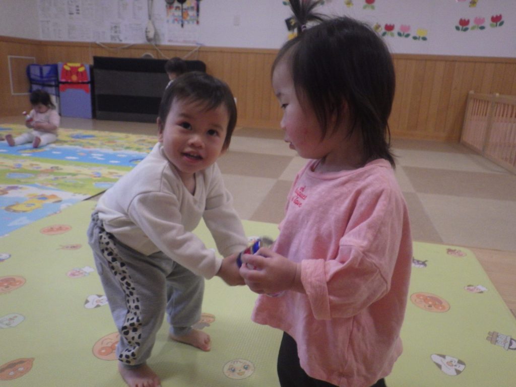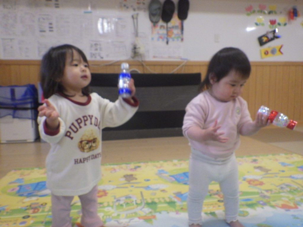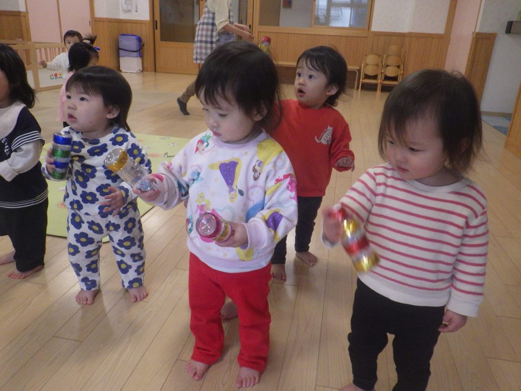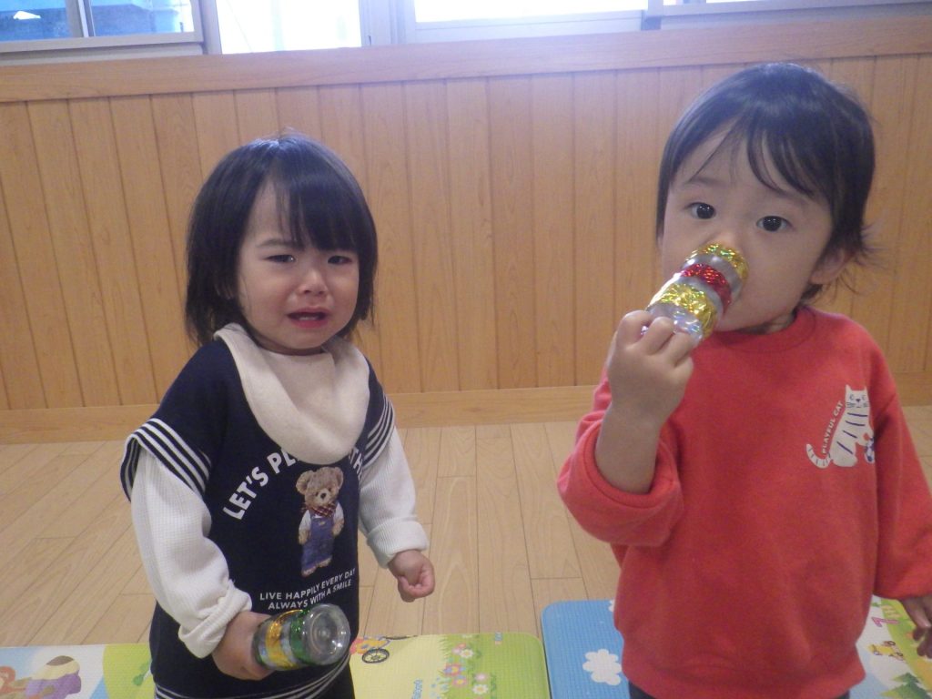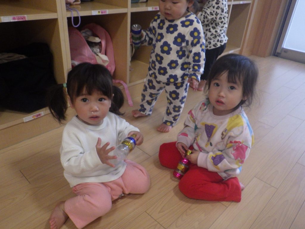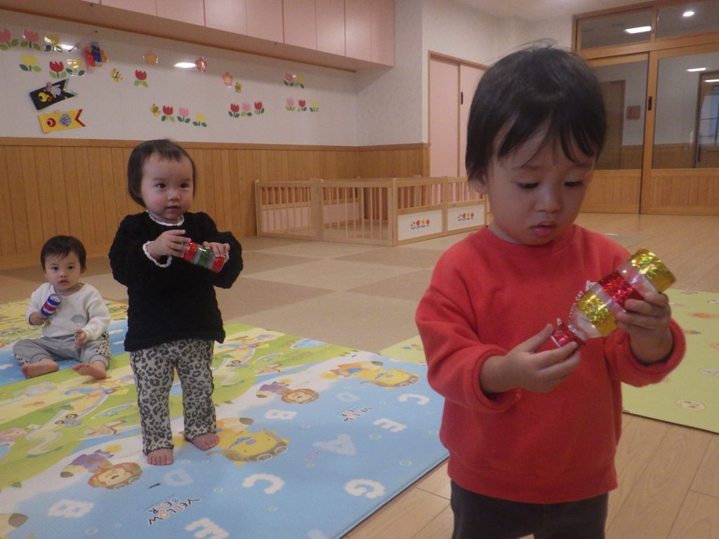 雨やお天気の悪い日が続いていますが、お部屋の中で 楽しく過ごしています。今日は新聞紙を使って、ビリビリやぶったり 集めたりして遊びました。音や感触が楽しいようで、夢中になって遊んでいました。それから・・・手作りマラカスをもち、音を鳴らして遊んだりもしています。これからも いろいろな遊びを楽しみたいと思います。